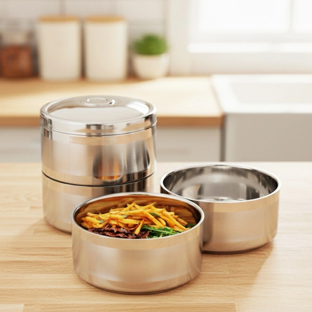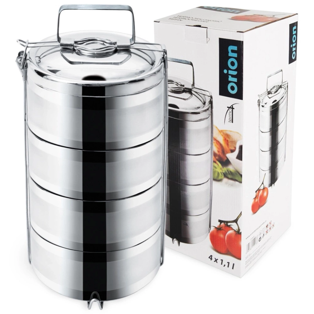 - Termiczna menażka do przenoszenia żywności. W zestawie 4 pojemniki, pokrywka oraz stelaż z uchwytem. Wykonana z najwyższej jakości stali nierdzewnej. Każdy pojemnik ma pojemność 1,1 l.