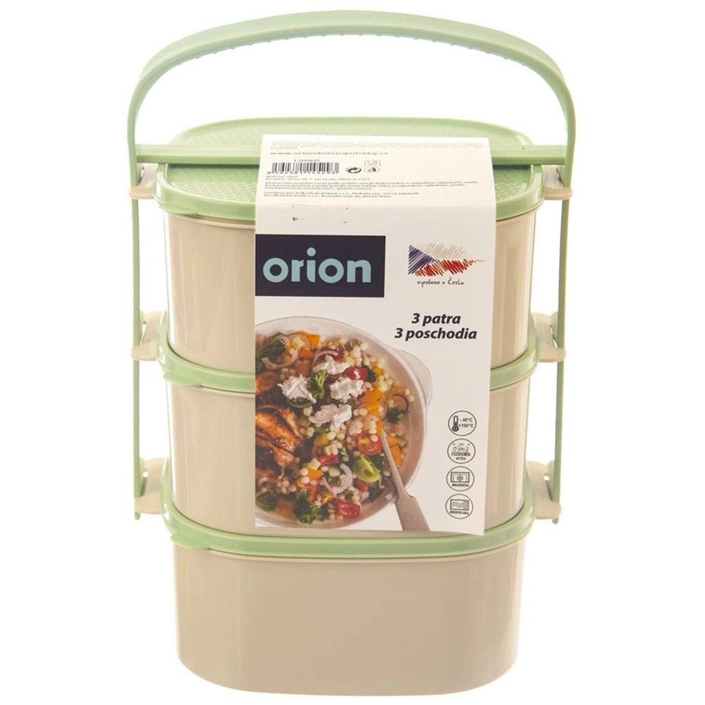 Menażka obiadowa do transportowania żywności. Wykonana z materiałów bezpiecznych dla zdrowia i neutralnych dla żywności. Posiada trzy pojemniki, które pozwolą odpowiednio przenieść posiłek. Pojemniki połączone są klamrą, dzięki czemu możemy wygodnie je piętrować. Doskonale sprawdzi się podczas wędrówek, biwaków, górskich wypraw oraz innych wypadów. Latem możemy wykorzystać ją do przechowywania i przenoszenia lodów np. podczas przyjęć w ogrodzie. Oryginalny produkt czeskiej marki Orion. Wyprodukowano zgodnie z europejskimi standardami.