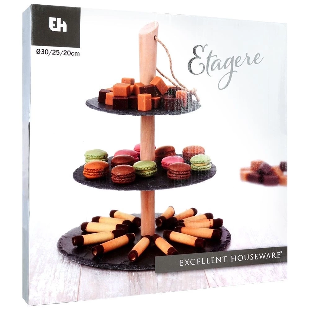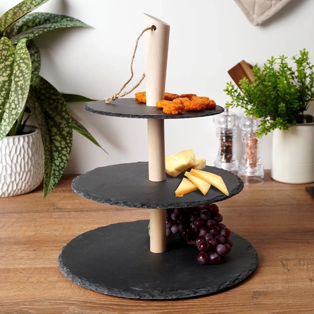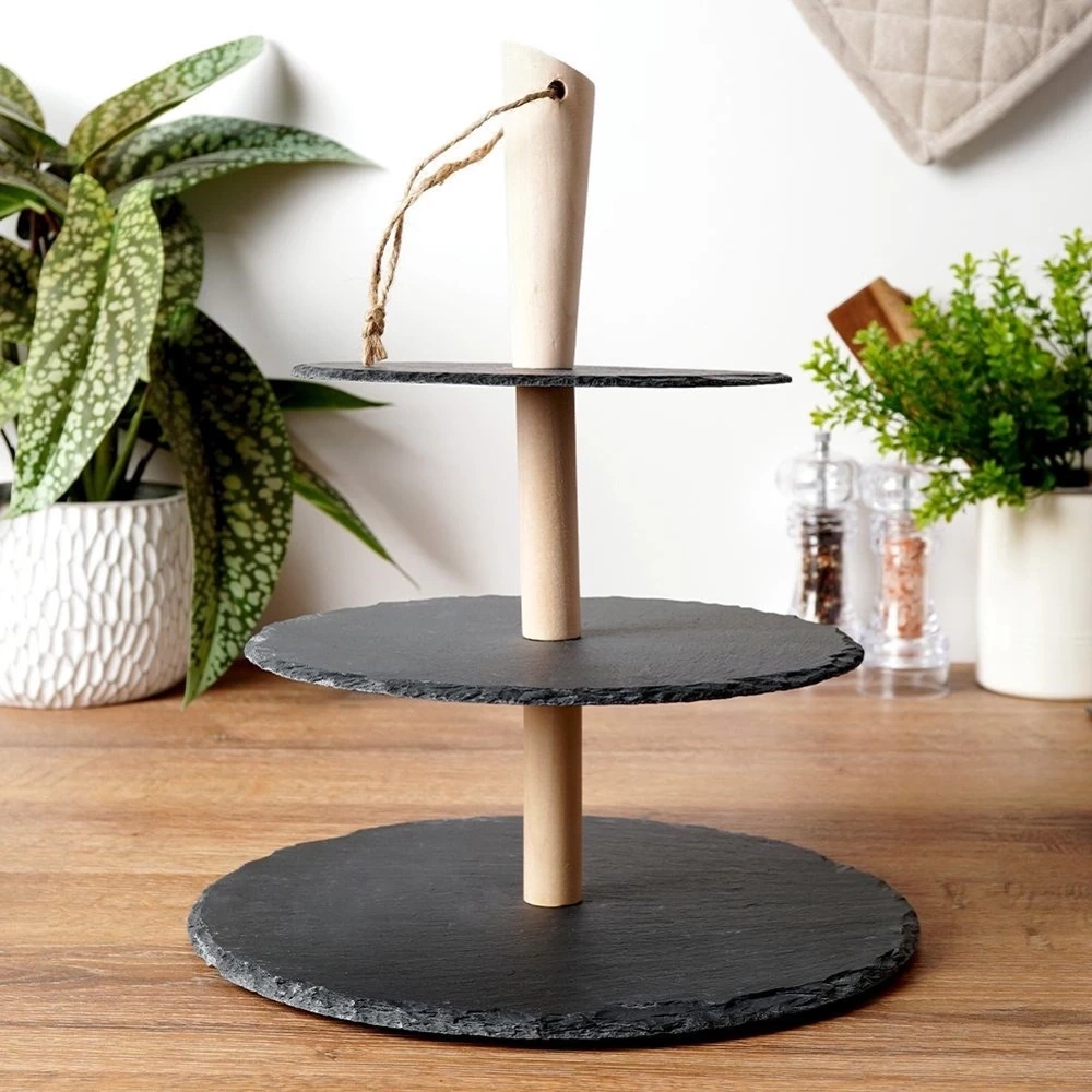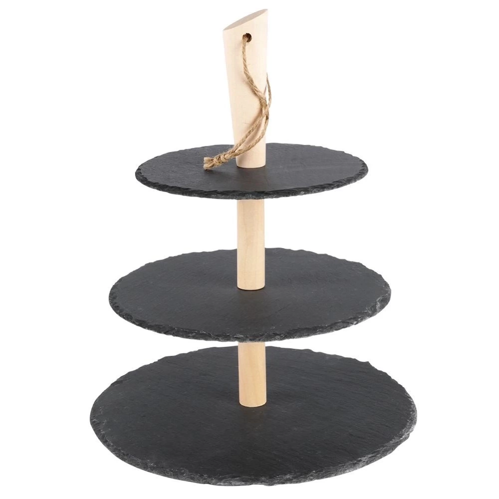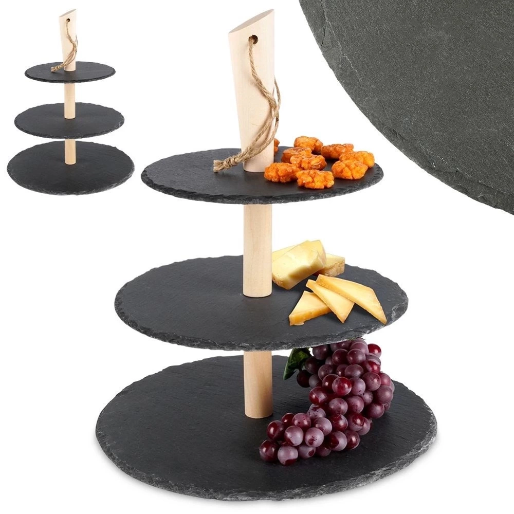 - TRZYPOZIOMOWA - Wyposażona w trzy kamienne tace o różnych średnicach. Taca duża o średnicy 30 cm, taca średnia o średnicy 25 cm oraz taca mała o średnicy 20 cm. Dzięki trzem piętrom możemy pięknie wyeksponować umieszczone na niej produkty.