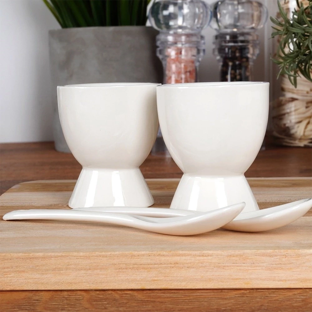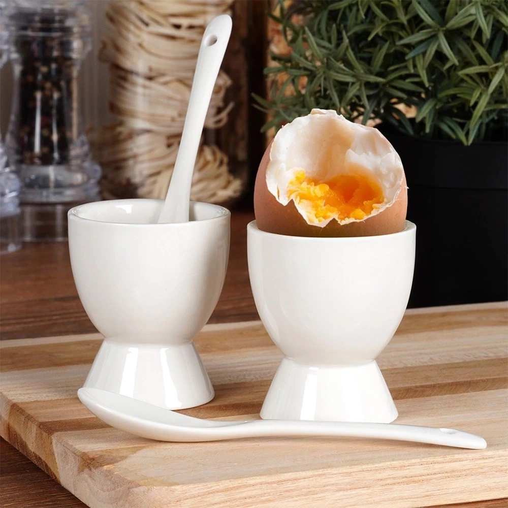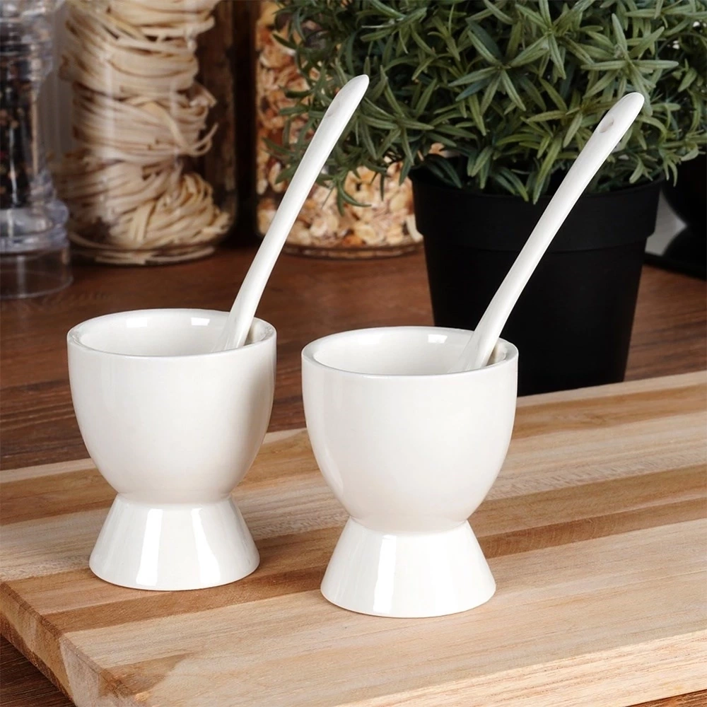 - Zestaw dwóch, białych podstawek porcelanowych do jajek z łyżeczkami. Sprawdzą się do wygodnego podawania i spożywania ugotowanych jajek.