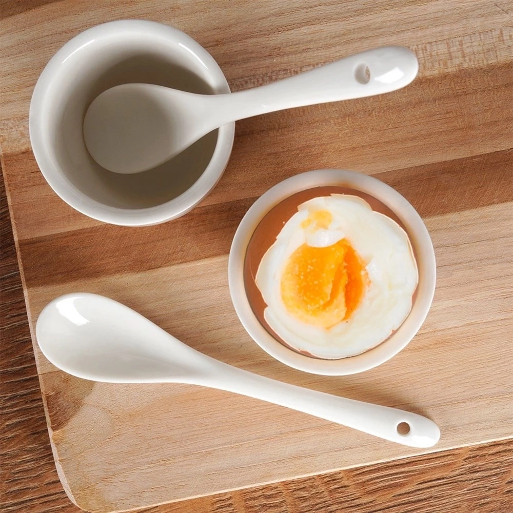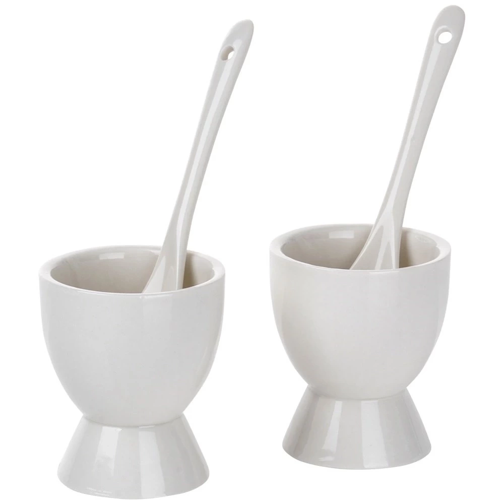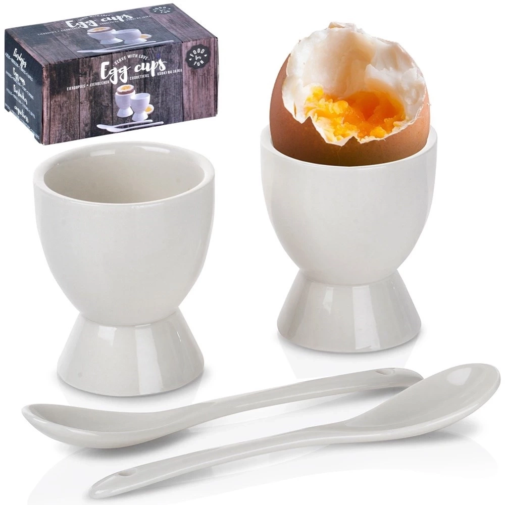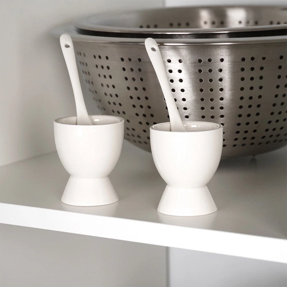 - Zestaw dwóch, białych podstawek porcelanowych do jajek z łyżeczkami. Sprawdzą się do wygodnego podawania i spożywania ugotowanych jajek.