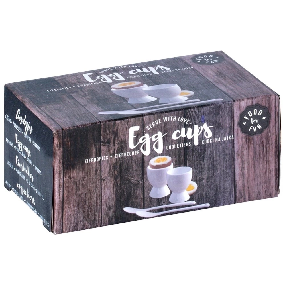Zestaw dwóch porcelanowych podstawek na jajka z łyżeczkami. Biały kolor podstawek sprawia, że będą idealnie pasować do każdej zastawy stołowej. Podstawki do jajek z łyżeczkami umożliwiają wygodne podawanie i spożywanie ugotowanych jajek. Umieszczone w podstawkach jajka na miękko prezentują się niezwykle efektownie. Idealny pomysł na prezent dla miłośników jajek na miękko. Całkowicie bezpieczna dla zdrowia i neutralna dla żywności. Wyprodukowano zgodnie z europejskimi standardami.