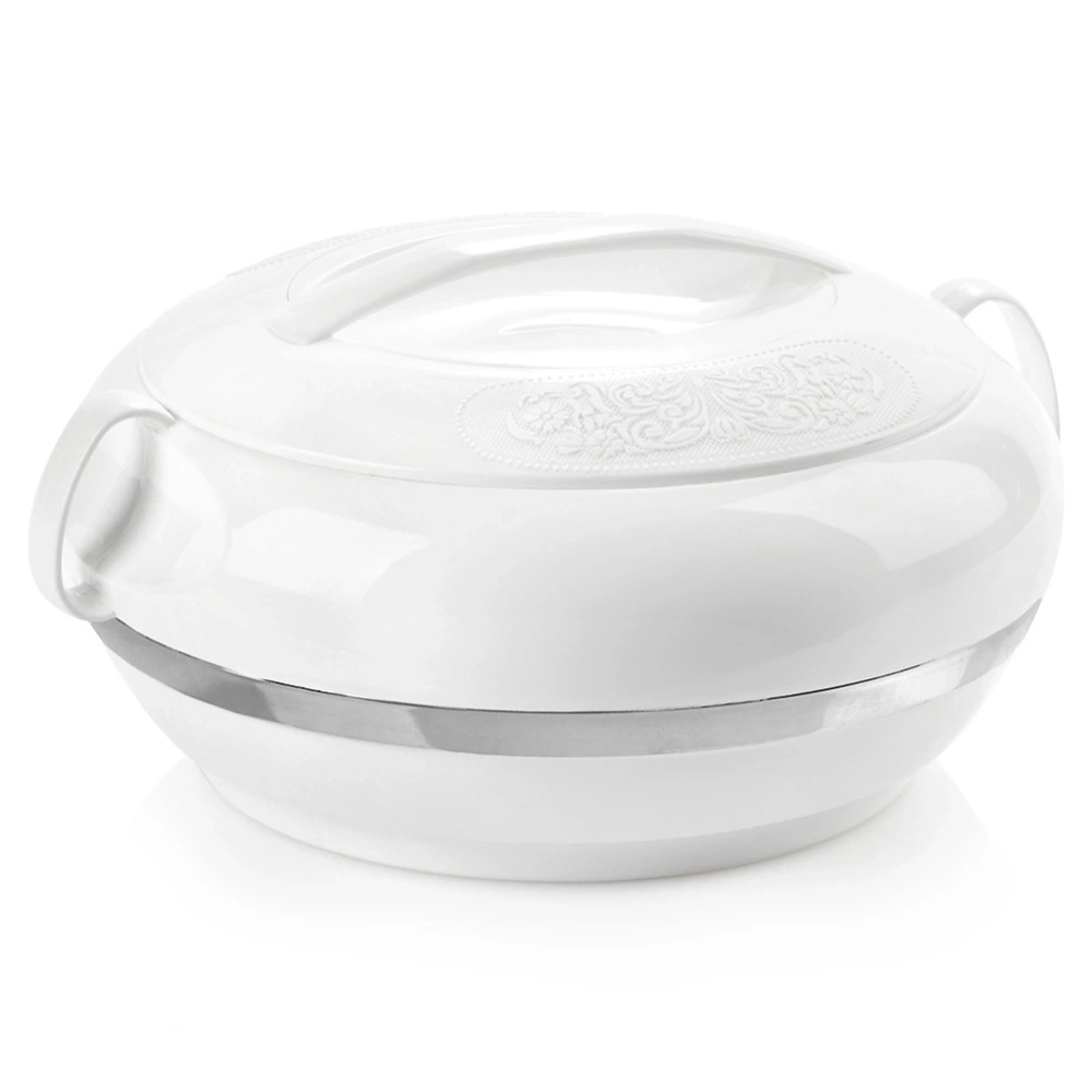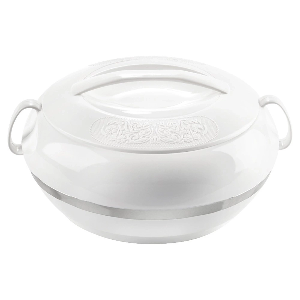 - WYTRZYMAŁA - Termomisa z zewnątrz wykonana z tworzywa w kolorze białym, wewnątrz ze stali nierdzewnej. Pokrywa posiada efektowny dekor.