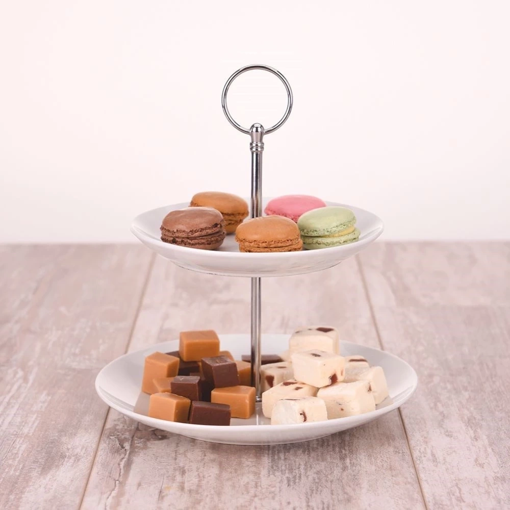 Dwupiętrowa patera do serwowania oraz ekspozycji. Świetnie prezentować się będą na niej babeczki, ciasteczka, różnego rodzaju desery jak również przystawki. Idealnie sprawdzi się do przygotowania słodkich stołów, dzięki niej w efektowny sposób wyeksponujemy na stole słodkości oraz słone przekąski. Sprawdzi się do użytku domowego oraz profesjonalnego. Wyprodukowano zgodnie z europejskimi standardami.