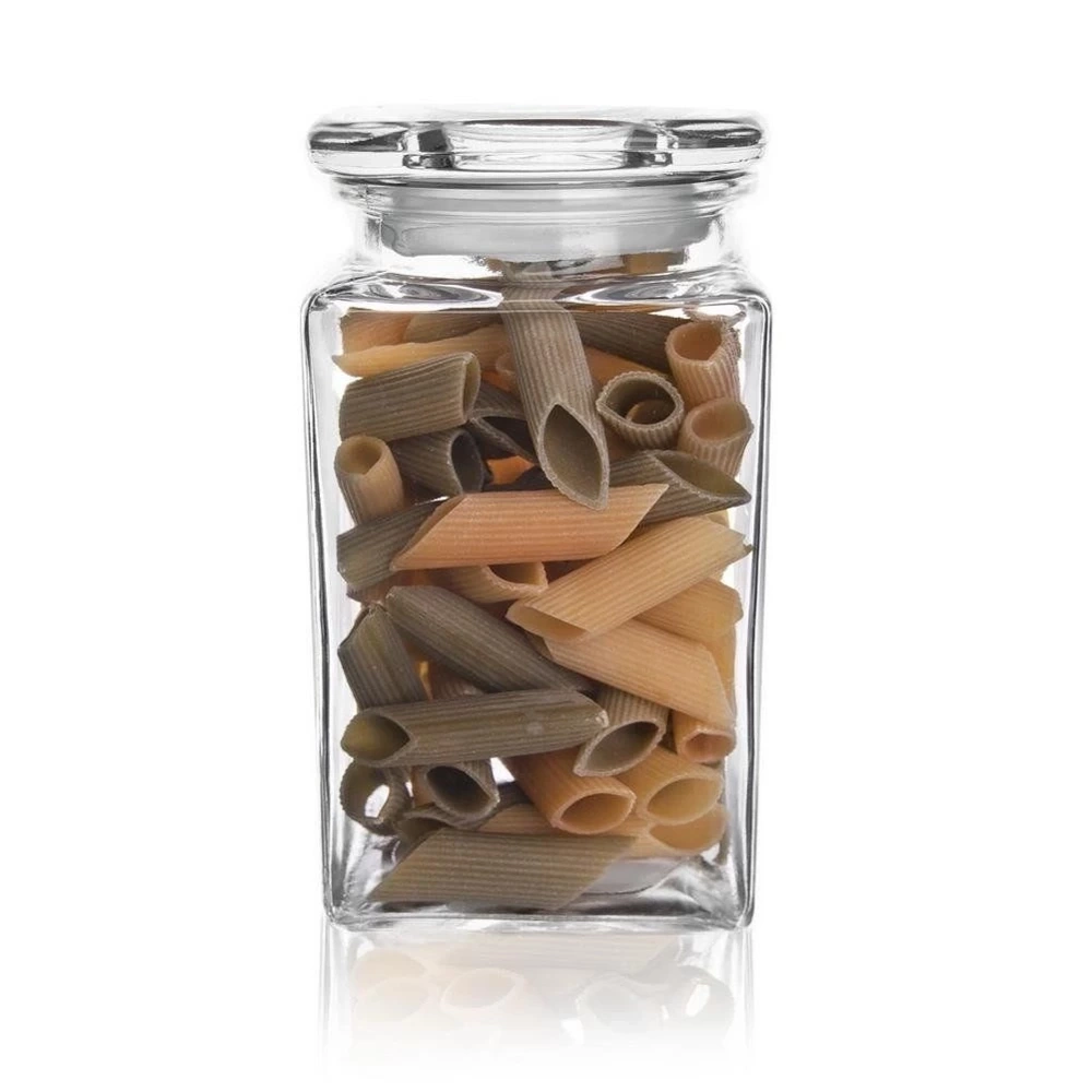 - Szklany, kwadratowy pojemnik z pokrywką wyposażoną w uszczelkę. Doskonale nadaje się do przechowywania różnych produktów, zarówno sypkich, jak i płynnych. Przydatny w każdym domu.