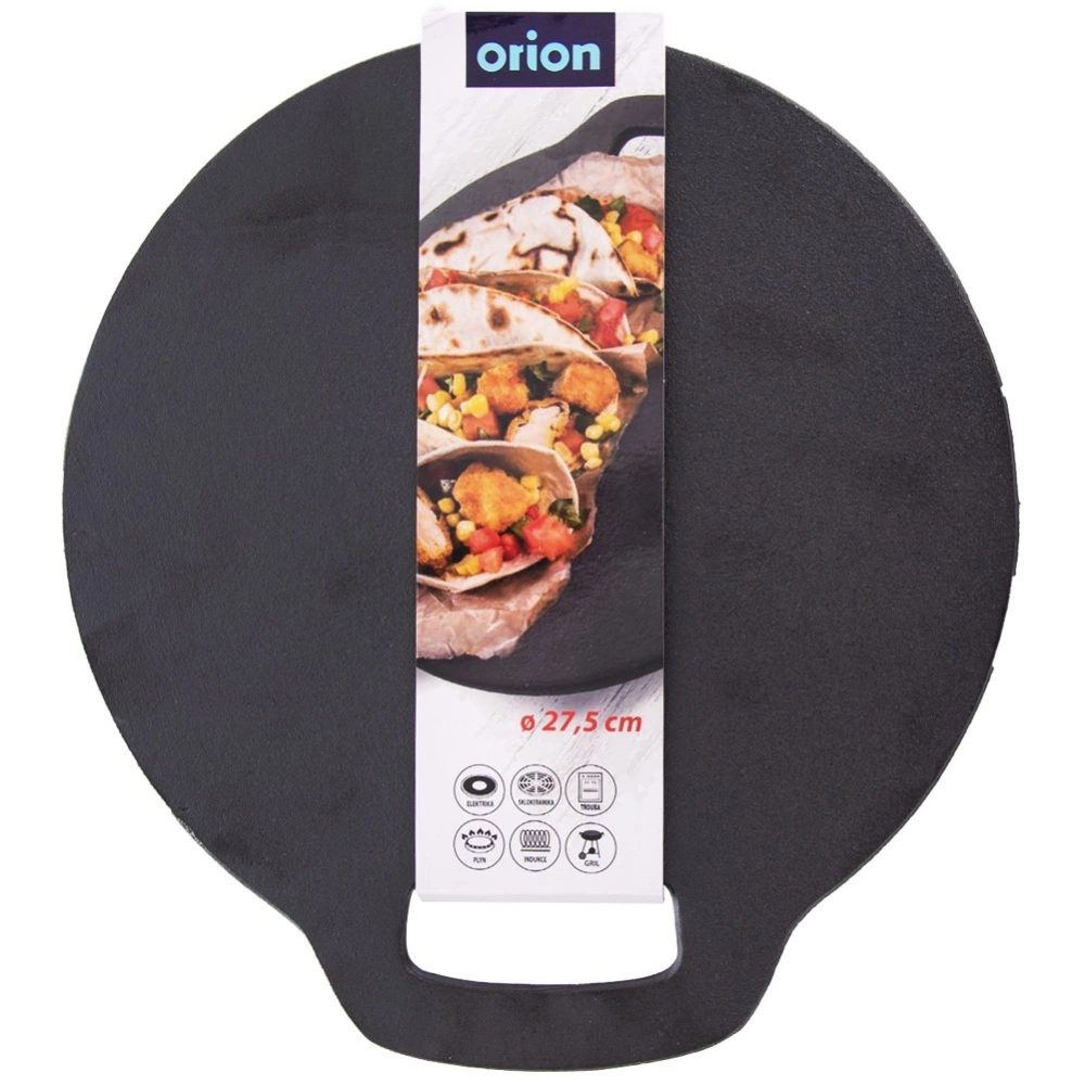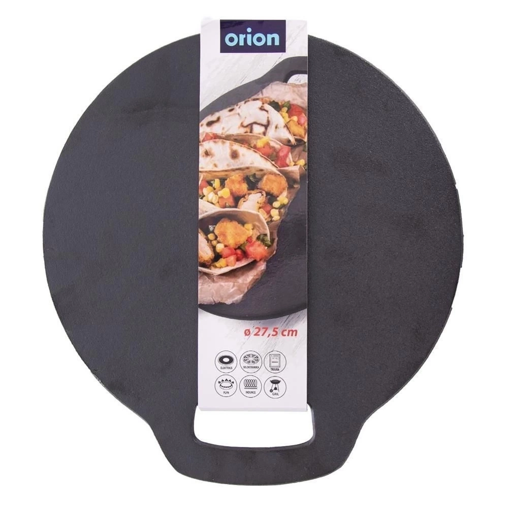 Solidna płyta żeliwna idealna do pieczenia placków ziemniaczanych, tortilli, langoszy oraz pizzy. Możemy użytkować ją w kuchence, piekarniku, ale również na ogniu. Po każdym użyciu umyć, wytrzeć suchą szmatką do sucha i natłuścić. Nie nadaje się do mycia w zmywarce. Oryginalny produkt czeskiej marki Orion. Wyprodukowano zgodnie z europejskimi standardami.