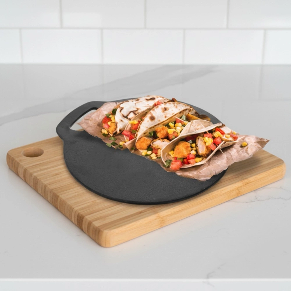 - Płyta żeliwna do pieczenia placków ziemniaczanych, tortilli, langoszy na kuchence lub ogniu. Na płycie możesz piec pizzę w piekarniku. Płyta może również służyć jako taca, talerz do serwowania.