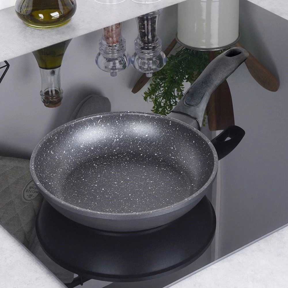 - Patelnia z powłoką Pfluon Granit. Idealna do duszenia oraz smażenia z minimalną ilością tłuszczu. Nadaje się na wszystkie rodzaje kuchni wraz indukcją, a także do zmywarki.