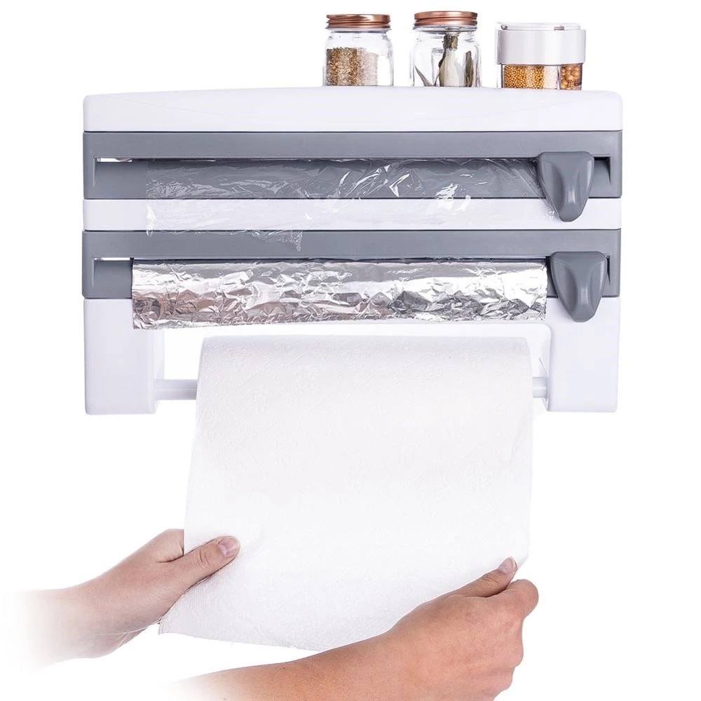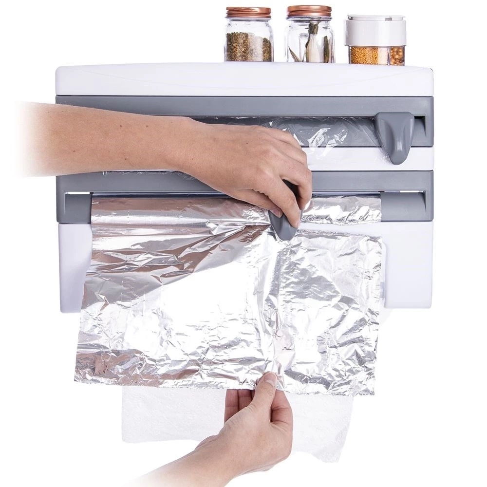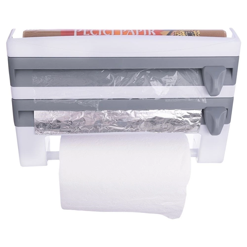- WYGODNY - Zapewnia szybki dostęp do folii spożywczej, ręczników kuchennych oraz folii aluminiowej. Posiada dwa ostrza do wygodnego obcinania folii.