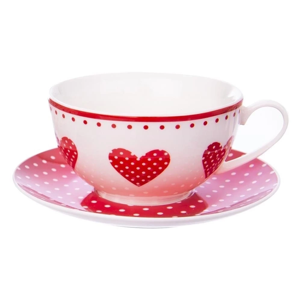 - PORCELANOWY - Zestaw wykonany jest z wysokiej jakości porcelany w białym kolorze. Naczynia posiadają efektowne zdobienia w formie serc i kropek na powierzchni w czerwonym kolorze. Odpowiednio użytkowane posłużą długie lata.