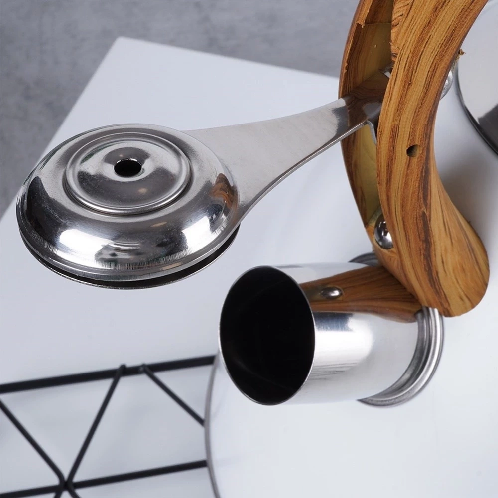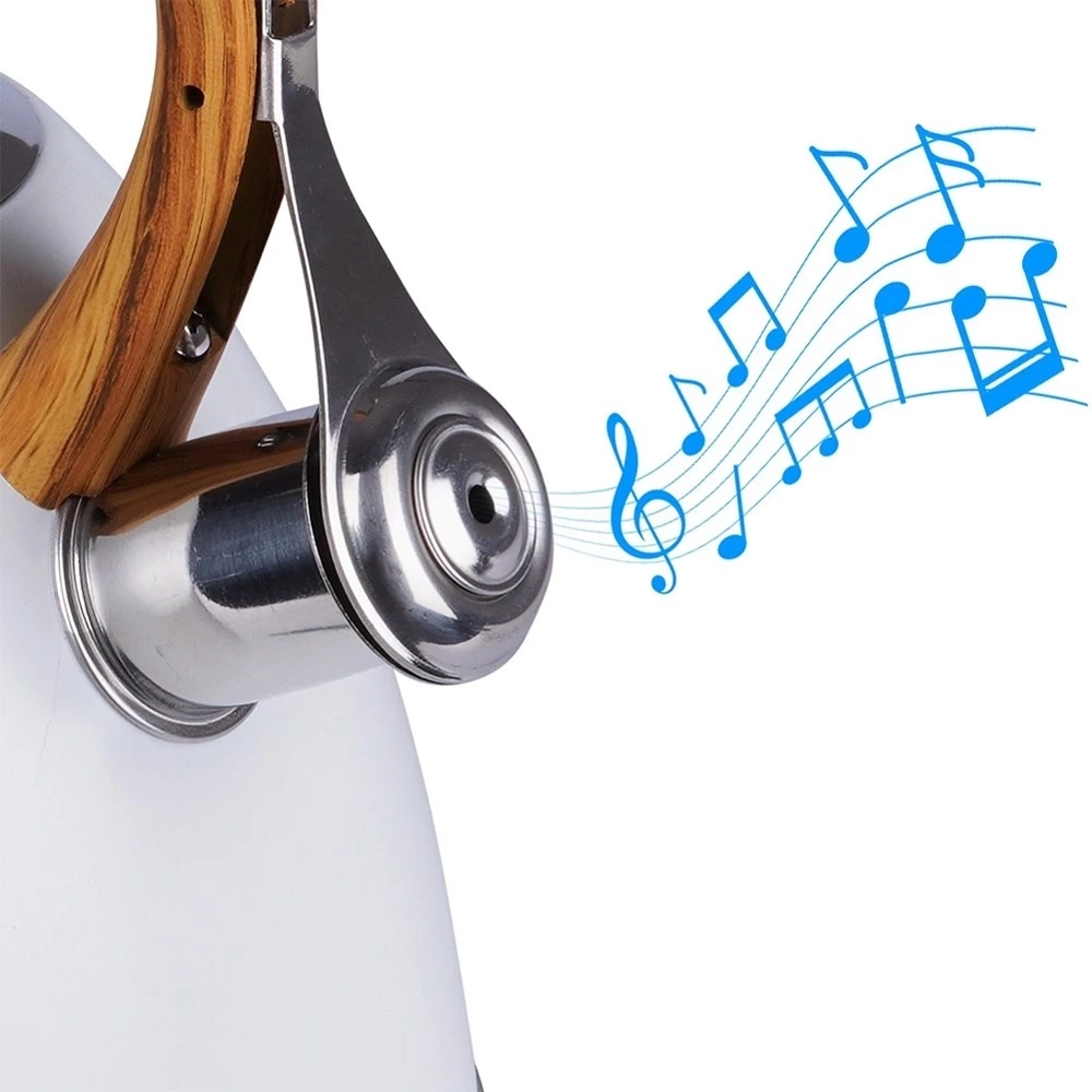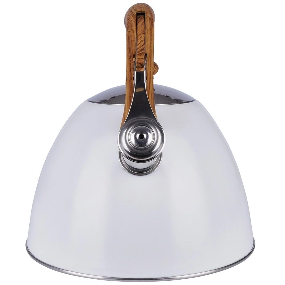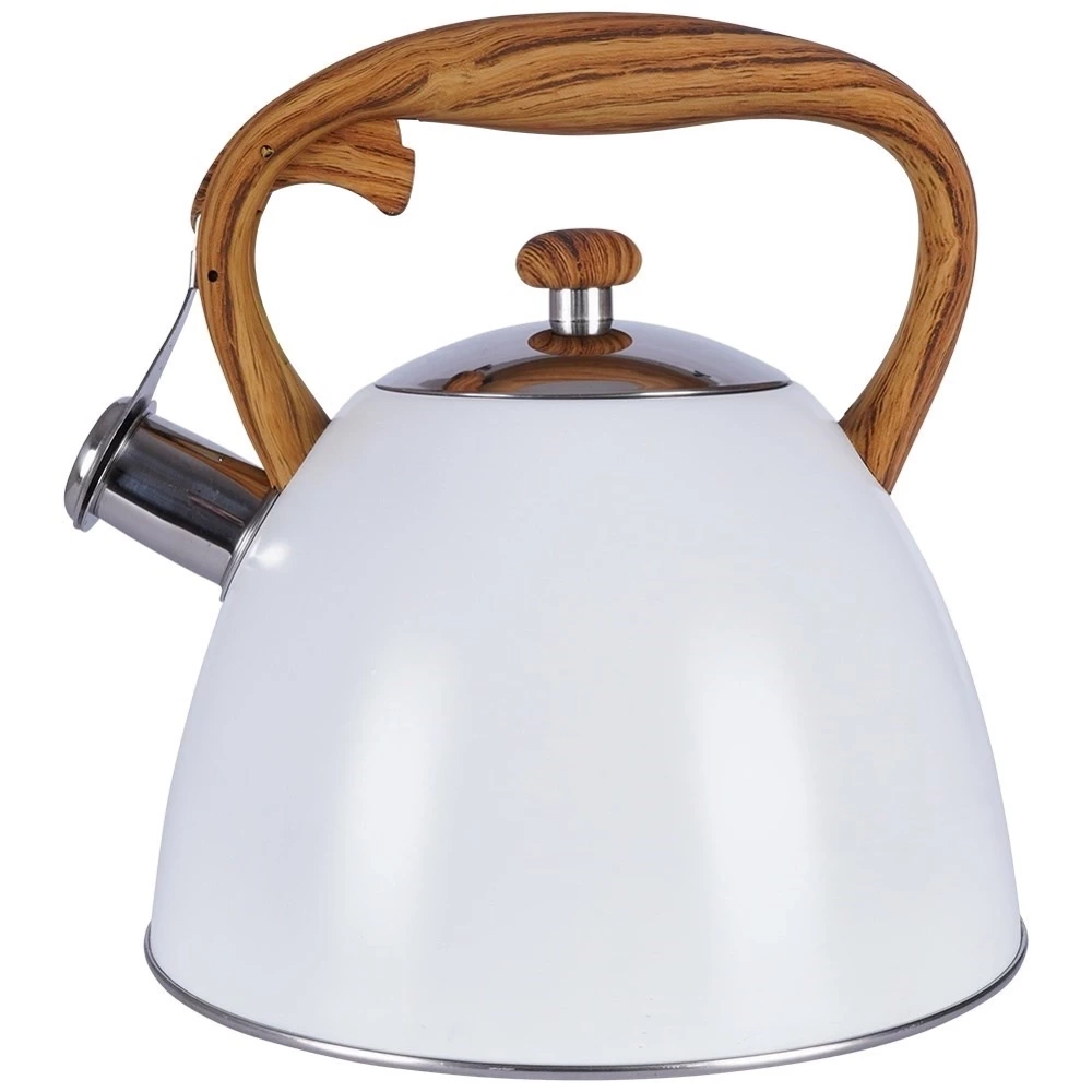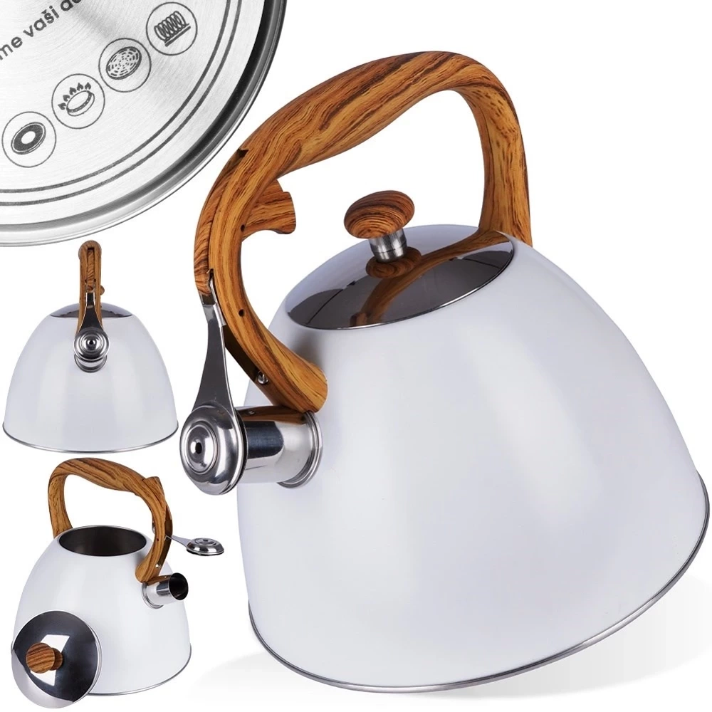 - Czajnik z automatycznym gwizdkiem o nowoczesnym wyglądzie. Wykonany ze stali nierdzewnej w kolorze białym, uchwyt z tworzywa imitującego drewno. Nadaje się do każdego rodzaju kuchenek wraz z indukcją.