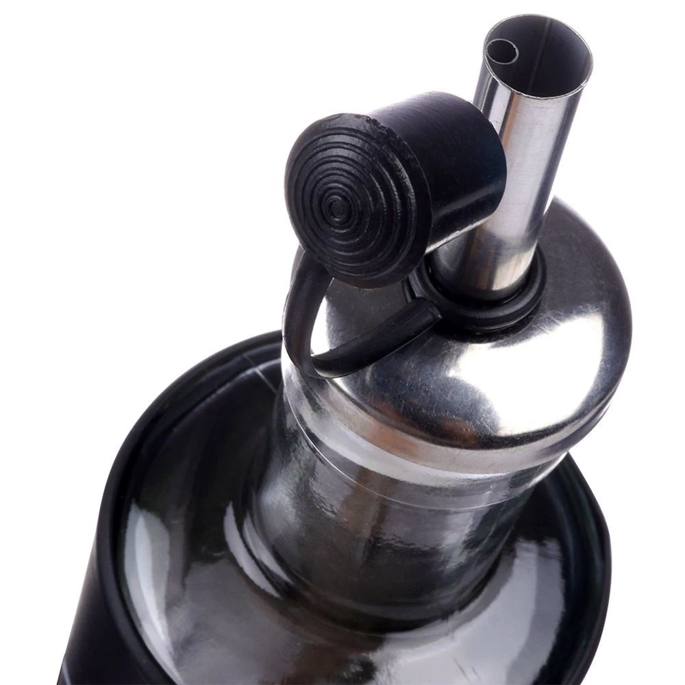 - Zestaw dwóch szklanych butelek do oliwy oraz octu. Butelki wyposażone w dozowniki z zatyczkami, które spowalniają przepływ oliwy i octu.