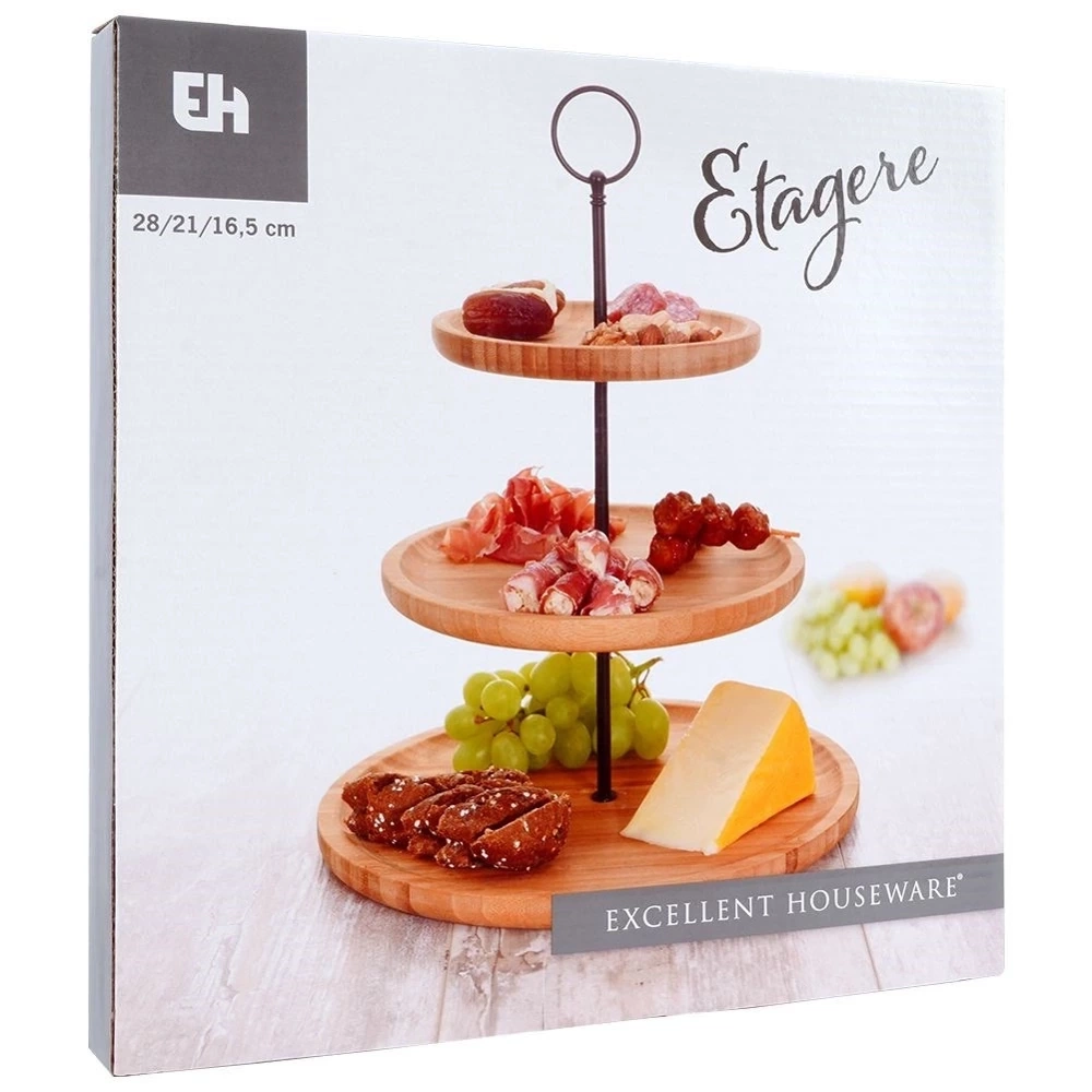 - Piętrowa patera na ciastka, ciasto, owoce, przystawki, przekąski. Posiada 3 poziomy składające się tac wykonanych z drewna bambusowego.