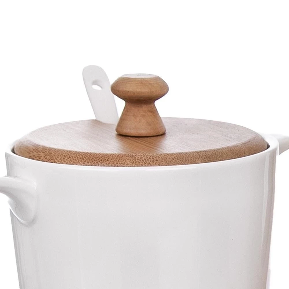 - SOLIDNY - Mlecznik, cukierniczka oraz łyżeczka wykonane są z najwyższej jakości porcelany w białym kolorze. Stojak oraz pokrywka są wykonane z drewna bambusowego.