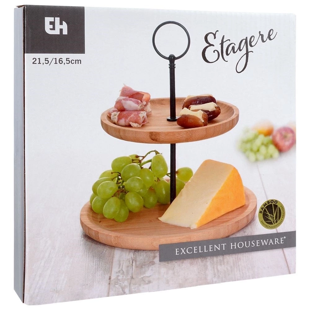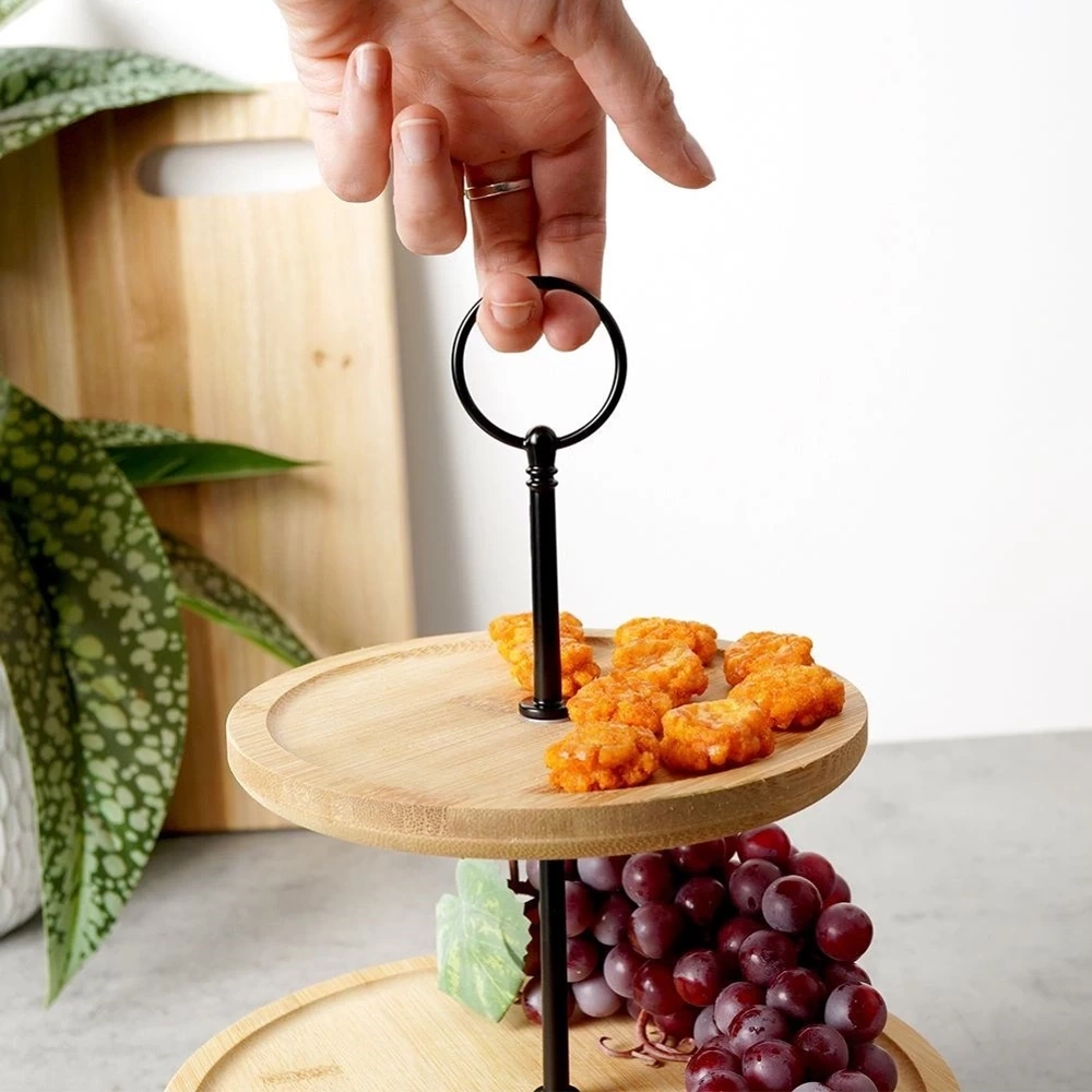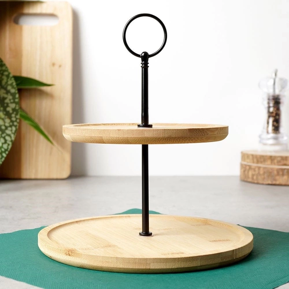 - Piętrowa patera na ciastka, ciasto, owoce, przystawki, przekąski. Posiada 2 poziomy składające się z tac wykonanych z drewna bambusowego.