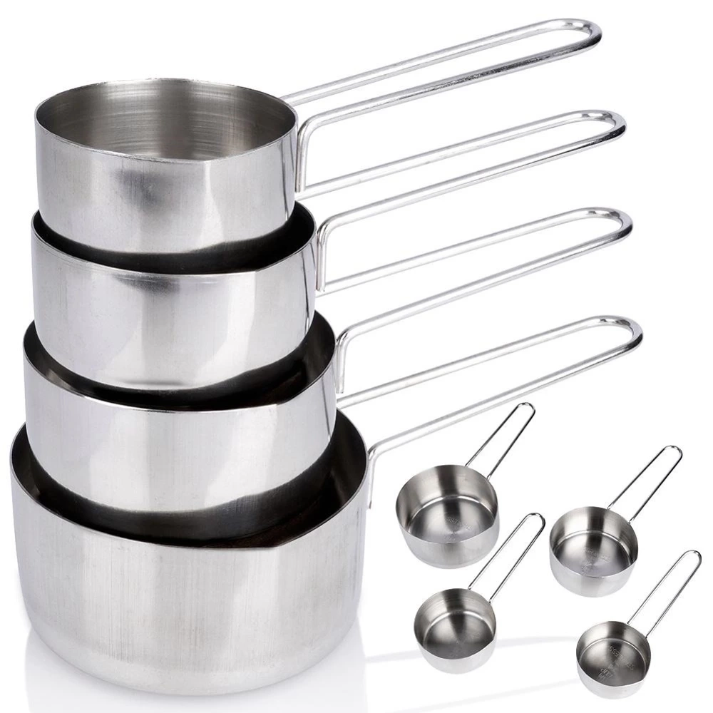 - UNIWERSALNE - Miarki doskonale sprawdzą się do odmierzania produktów sypkich oraz płynnych. Można je wykorzystać do odmierzania mąki, cukru, przypraw, oleju, płynów i wielu innych składników podczas gotowania i pieczenia.