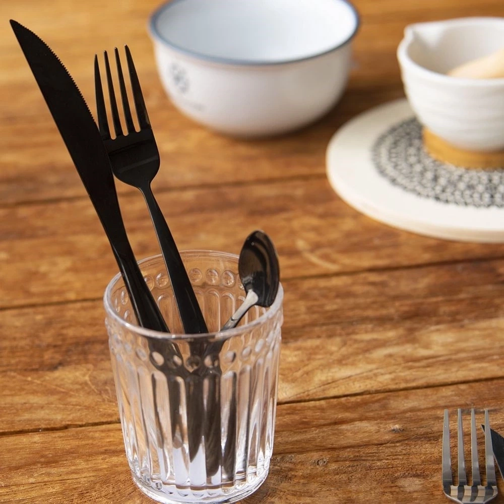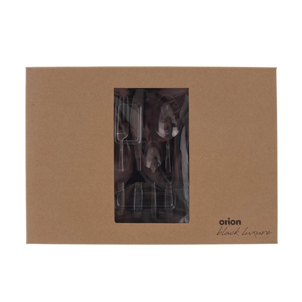 - Zestaw eleganckich sztućców dla 6 osób w czarnym, błyszczącym kolorze. Zestaw zawiera 24 elementy w tym: łyżki, widelce, noże oraz łyżeczki do herbaty.