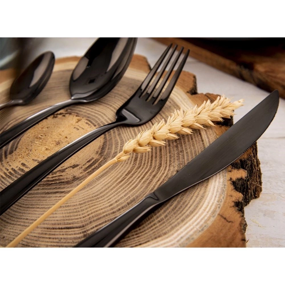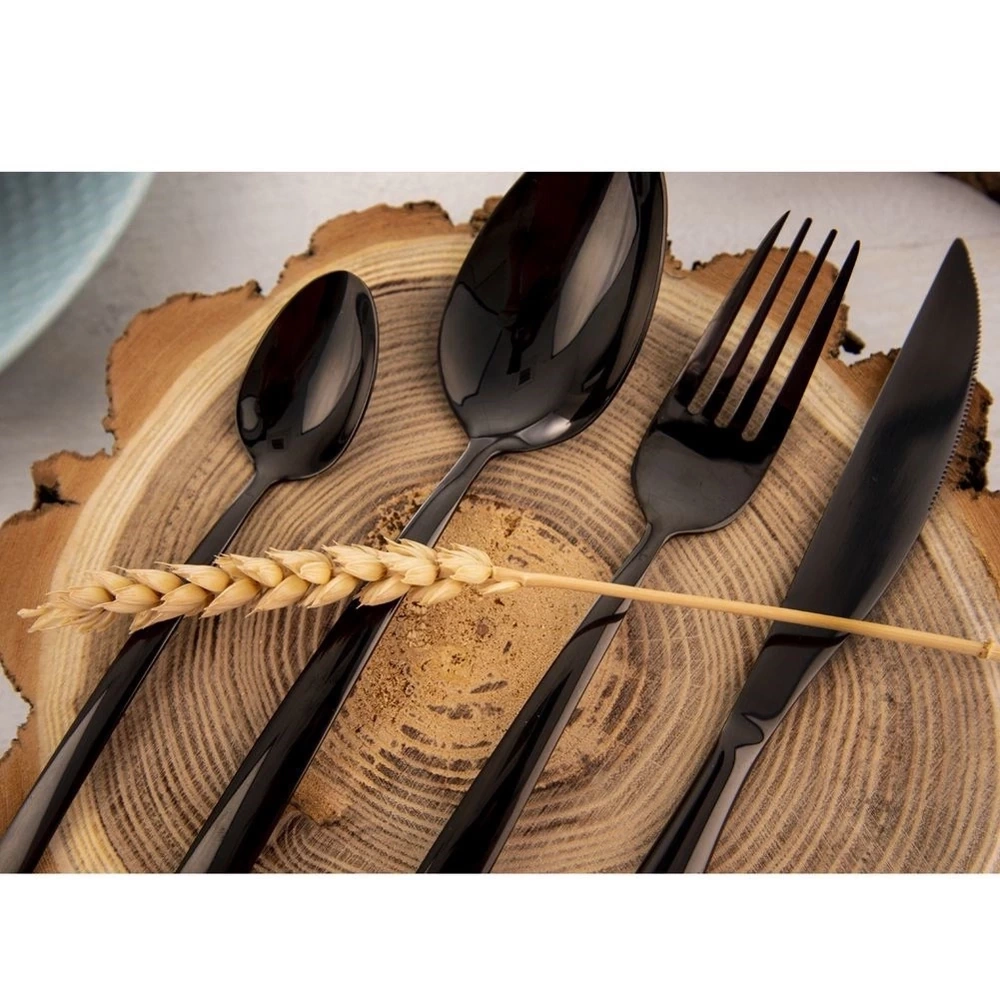 - MODNY DESIGN - Zestaw luksusowych sztućców z serii BLACK LUXURY w czarnym kolorze dla 6 osób. Niezwykle elegancki komplet zawiera 24 elementy. W zestawie: 6x łyżka (długość 21,5 cm i szerokości 4,5 cm), 6x widelec (długość 21 cm), 6x nóż (długość 23,5 cm) oraz 6x łyżeczka do herbaty (długość 14 cm).