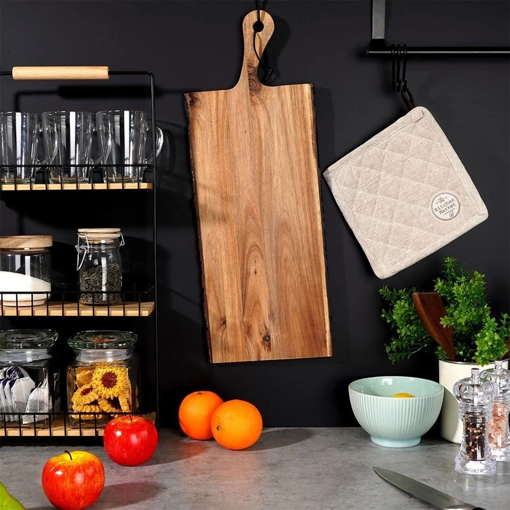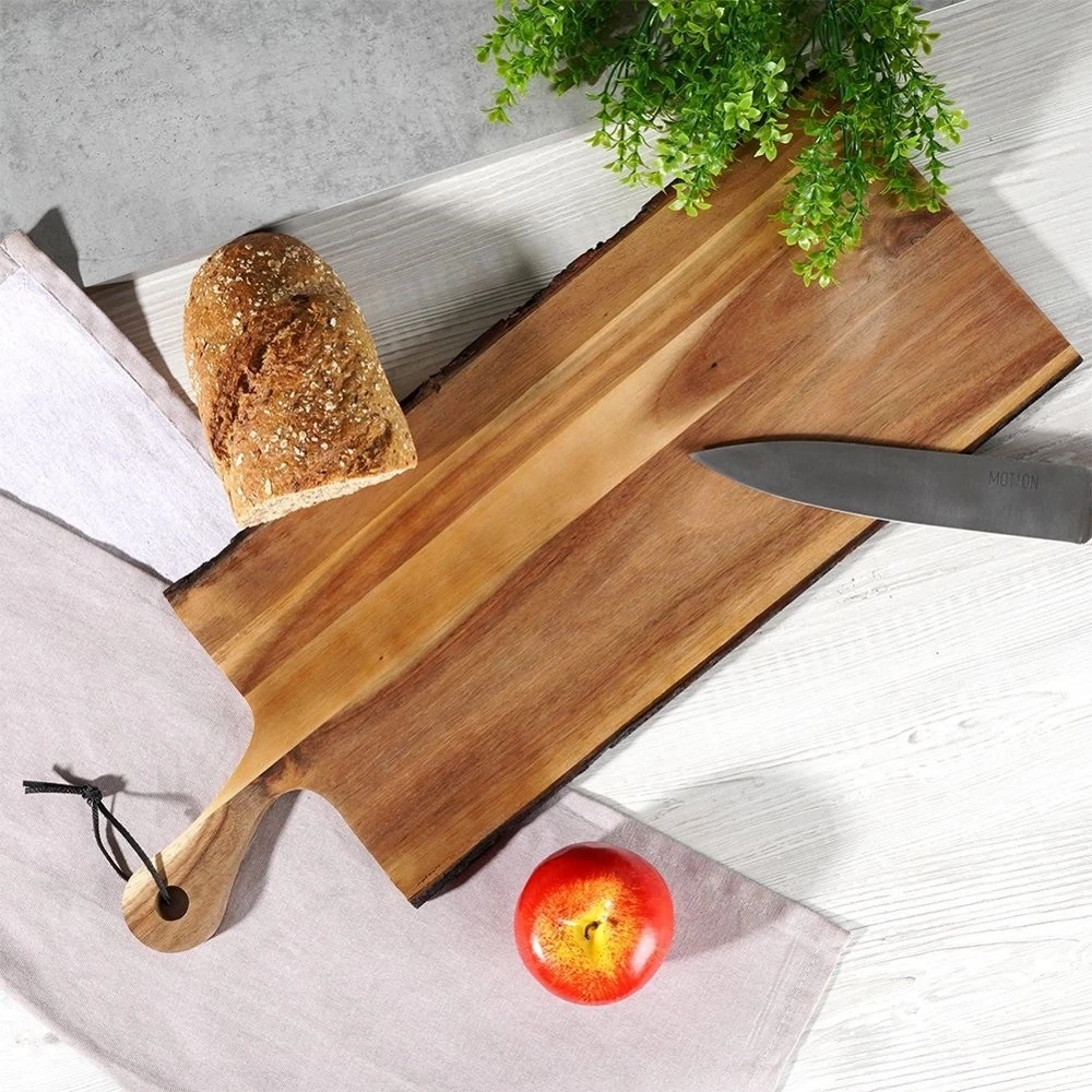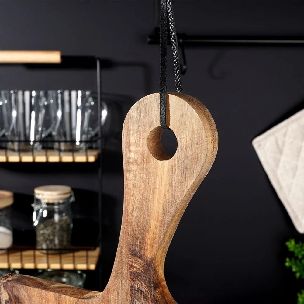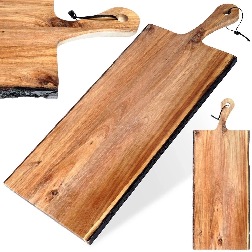 - Duża deska do krojenia i serwowania wykonana z drewna akacjowego. Deska wraz z uchwytem posiada aż 56 cm długości.