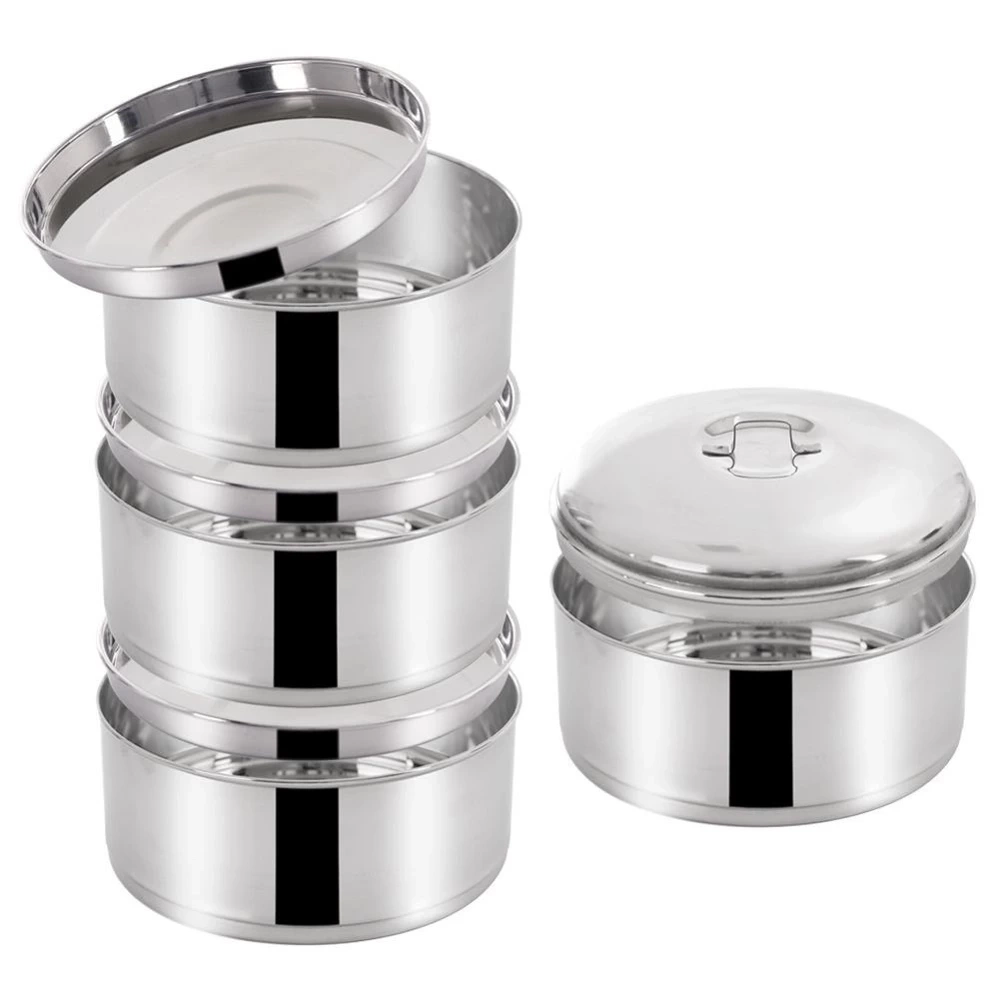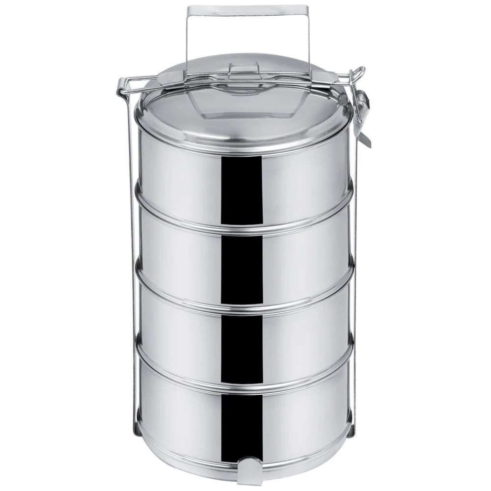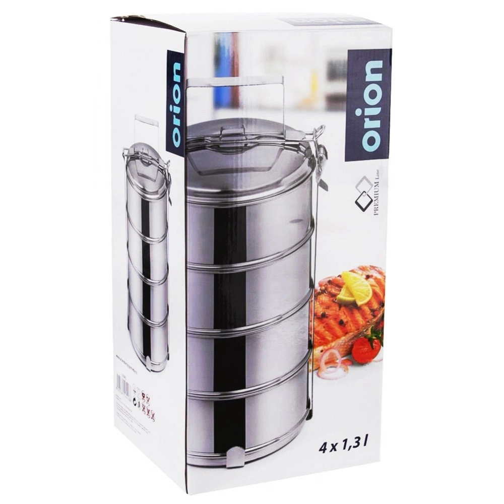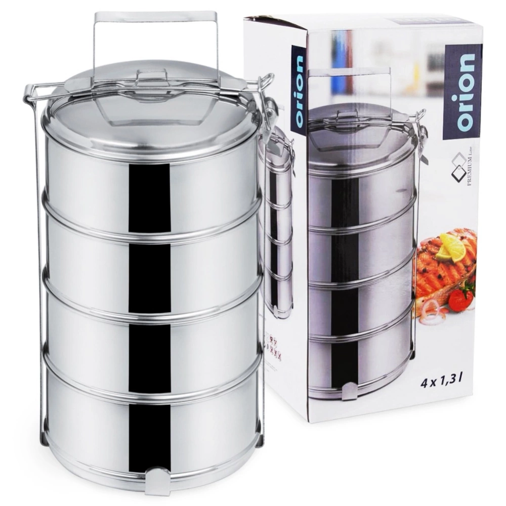 - Menażka do przenoszenia żywności. W zestawie 4 pojemniki z pokrywkami oraz stelaż z uchwytem. Wykonana z najwyższej jakości stali nierdzewnej. Każdy pojemnik ma pojemność 1,3 l.
