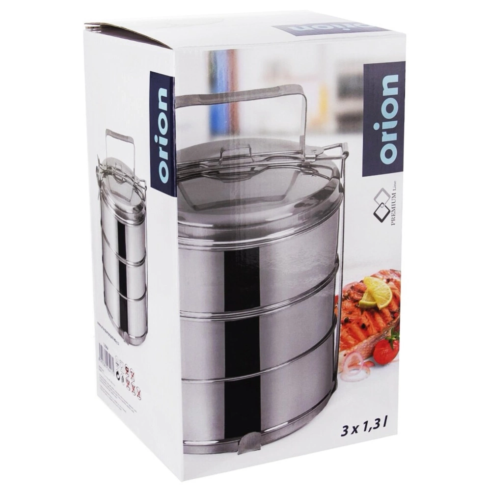 Menażka obiadowa do transportowania żywności. Wykonana z materiałów bezpiecznych dla zdrowia i neutralnych dla żywności. Posiada trzy pojemniki, które pozwolą odpowiednio przenieść posiłek. Pojemniki połączone są klamrą, dzięki czemu możemy wygodnie je piętrować. Doskonale sprawdzi się podczas wędrówek, biwaków, górskich wypraw oraz innych wypadów. Latem możemy wykorzystać ją do przechowywania i przenoszenia lodów np. podczas przyjęć w ogrodzie. Oryginalny produkt czeskiej marki Orion. Wyprodukowano zgodnie z europejskimi standardami.