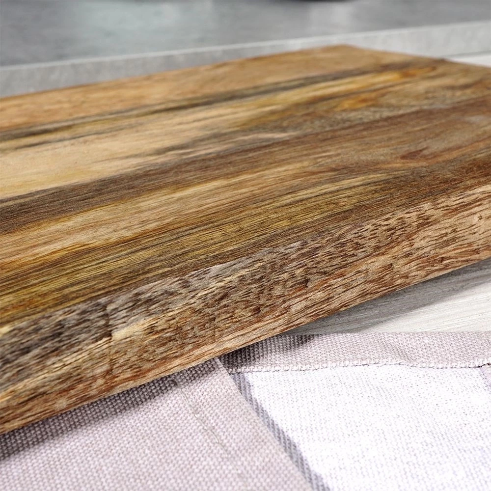 - DREWNIANA - Wytrzymała i solidna deska wykonana z drewna mangowca o wymiarze 44 x 19 cm. Grubość deski wynosi 2 cm. Drewno mangowca jest odporne na wilgoć i odkształcenia, nie chłonie zapachów, szybko schnie.