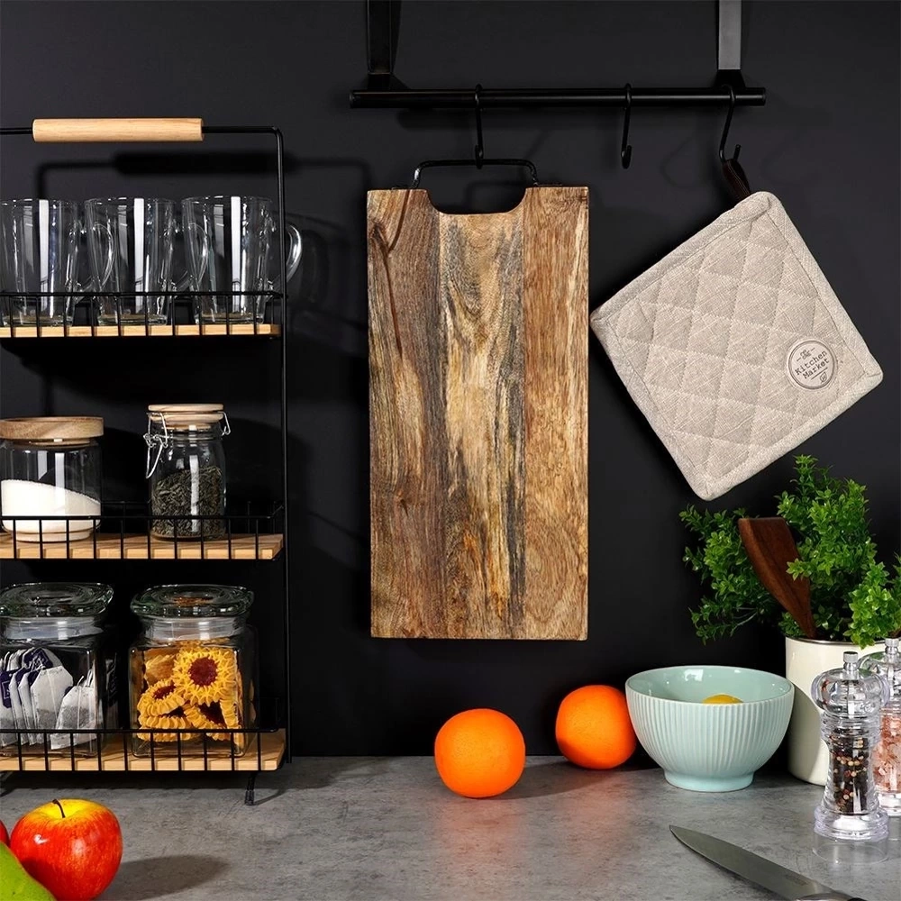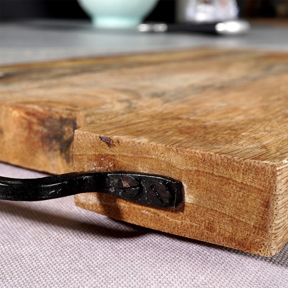 - WYGODNA - Wyposażona w uchwyt z tworzywa ułatwiający przenoszenie. Postarzany wygląd dzięki czarnemu metalowemu uchwytowi z elementami rdzy. Możliwość zawieszenia deski ułatwi jej przechowywanie.