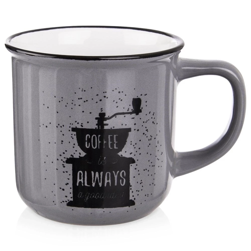 - CERAMICZNY - Kubek wykonany z najwyższej jakości ceramiki w szarym kolorze. Posiada ciekawy, czarny dekor w postaci młynka do kawy z napisem.