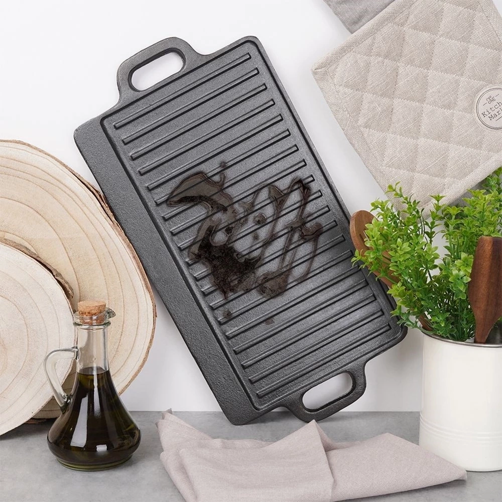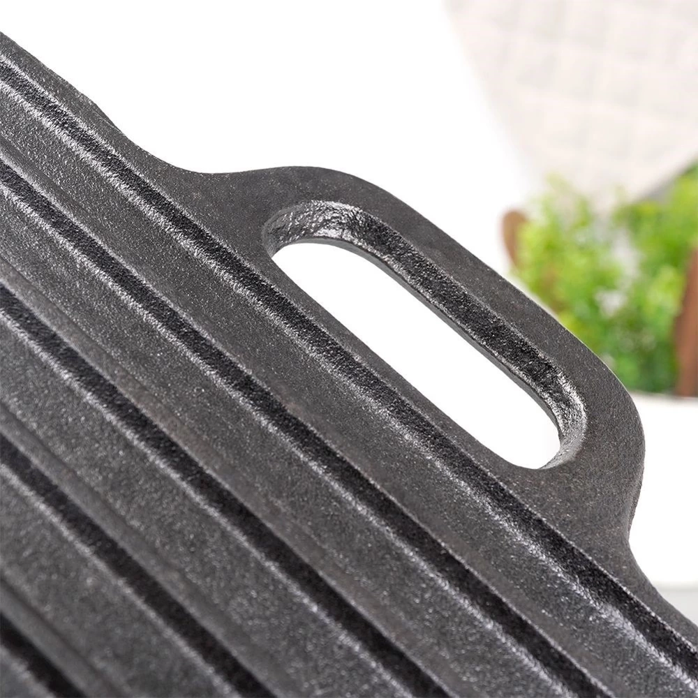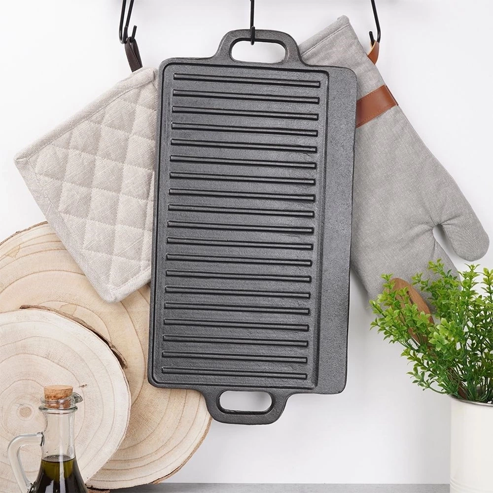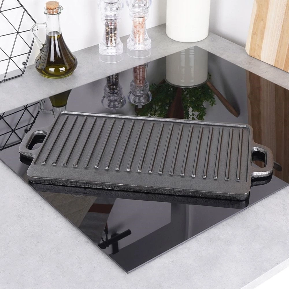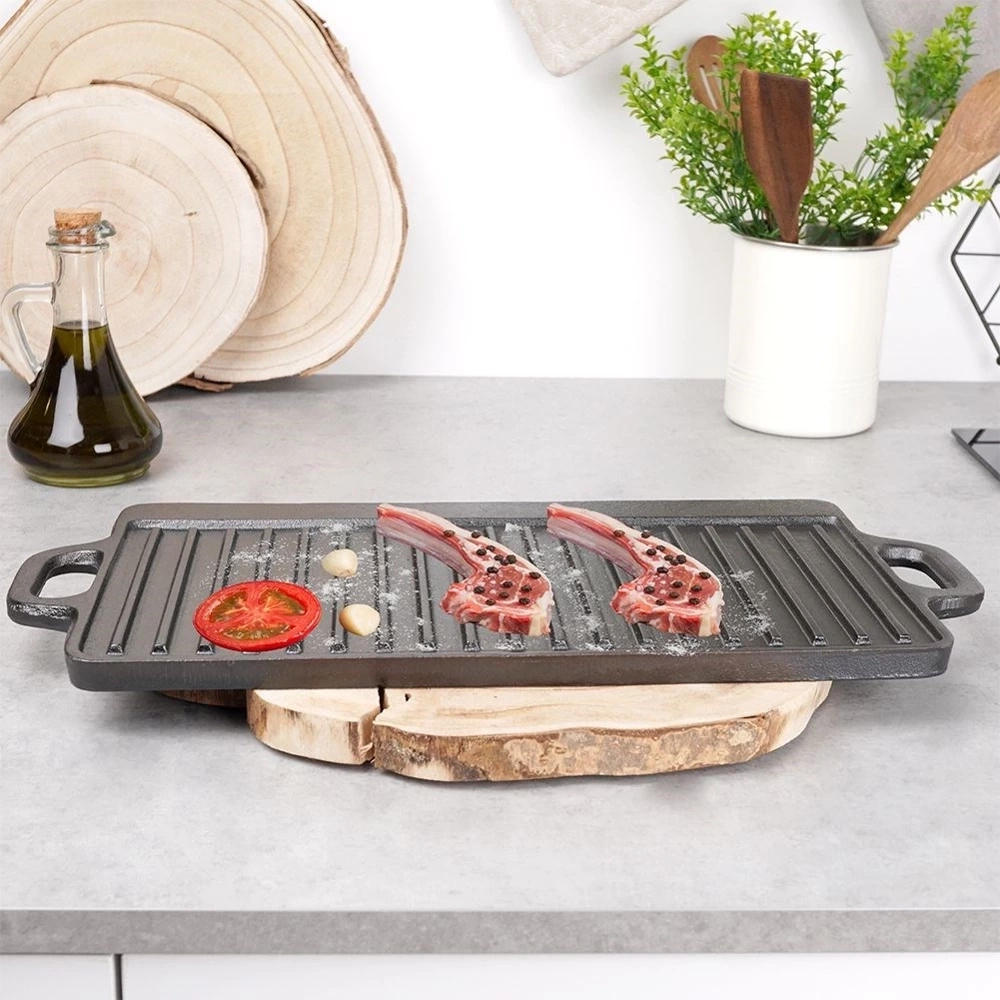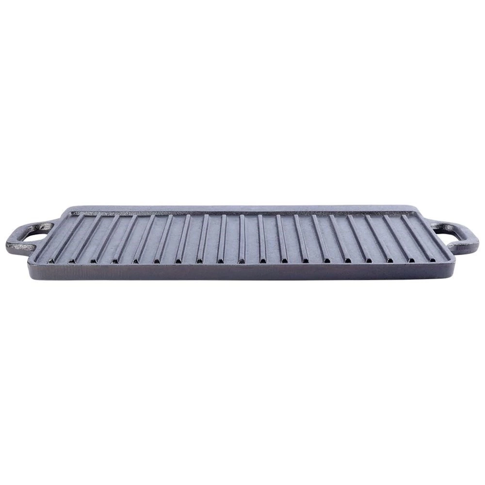 - Dwustronna płyta grillowa wykonana z żeliwa. Karbowana do grillowania mięs, ryb i warzyw. Do zastosowania w piekarniku, na grillu lub kuchence. Odporna na wysokie temperatury.