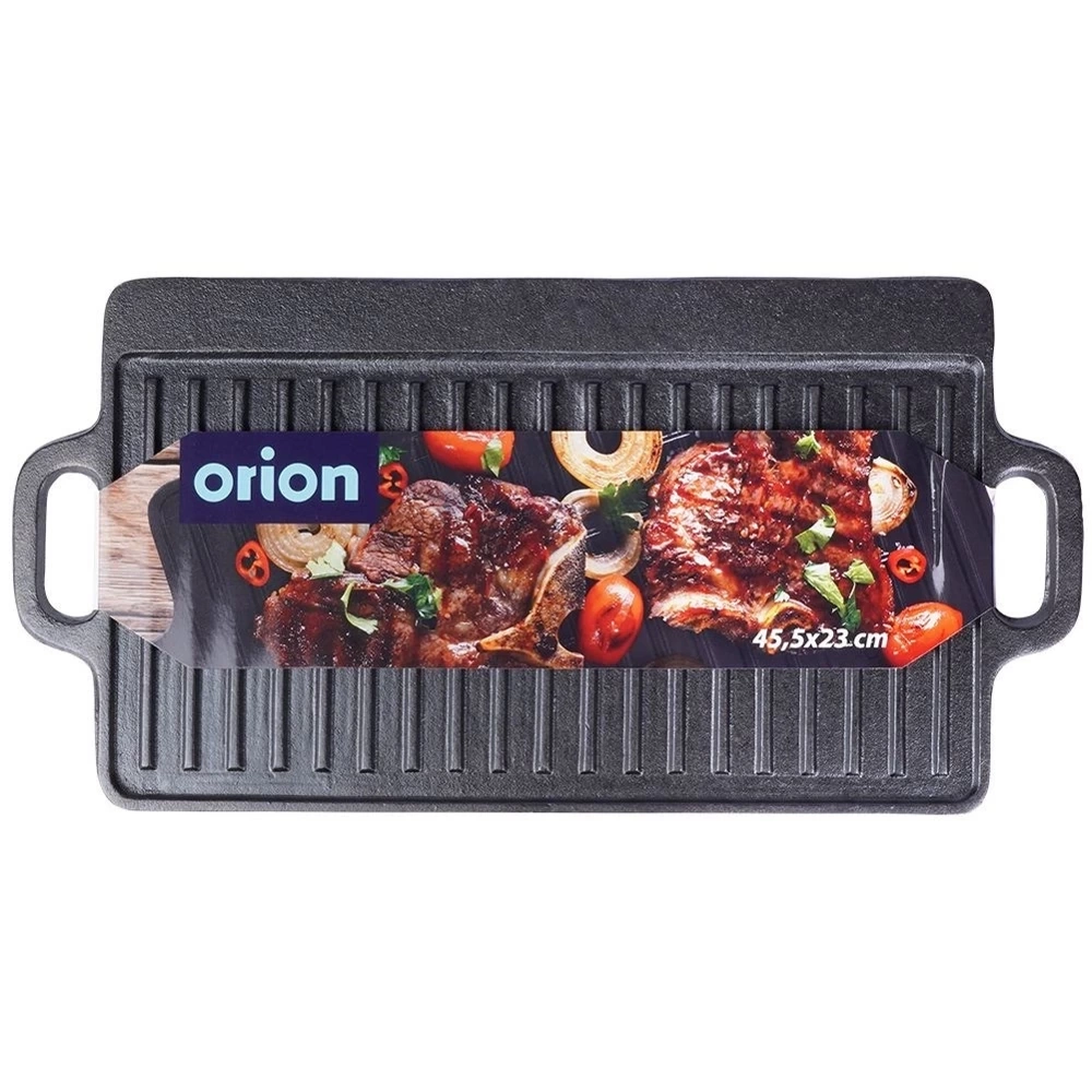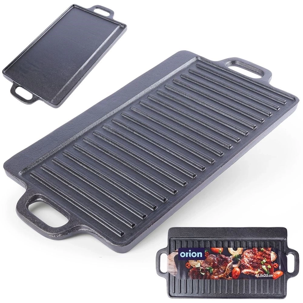 Płyta żeliwna do grillowania mięs, ryb, warzyw. Patelnia jest dwustronna, więc możemy odpowiednio użytkować ją w zależności od potrzeby. UWAGA! Po każdym użyciu umyć, wytrzeć suchą szmatką do sucha i natłuścić. Nie nadaje się do mycia w zmywarce. Oryginalny produkt czeskiej marki Orion. Wyprodukowano zgodnie z europejskimi standardami.