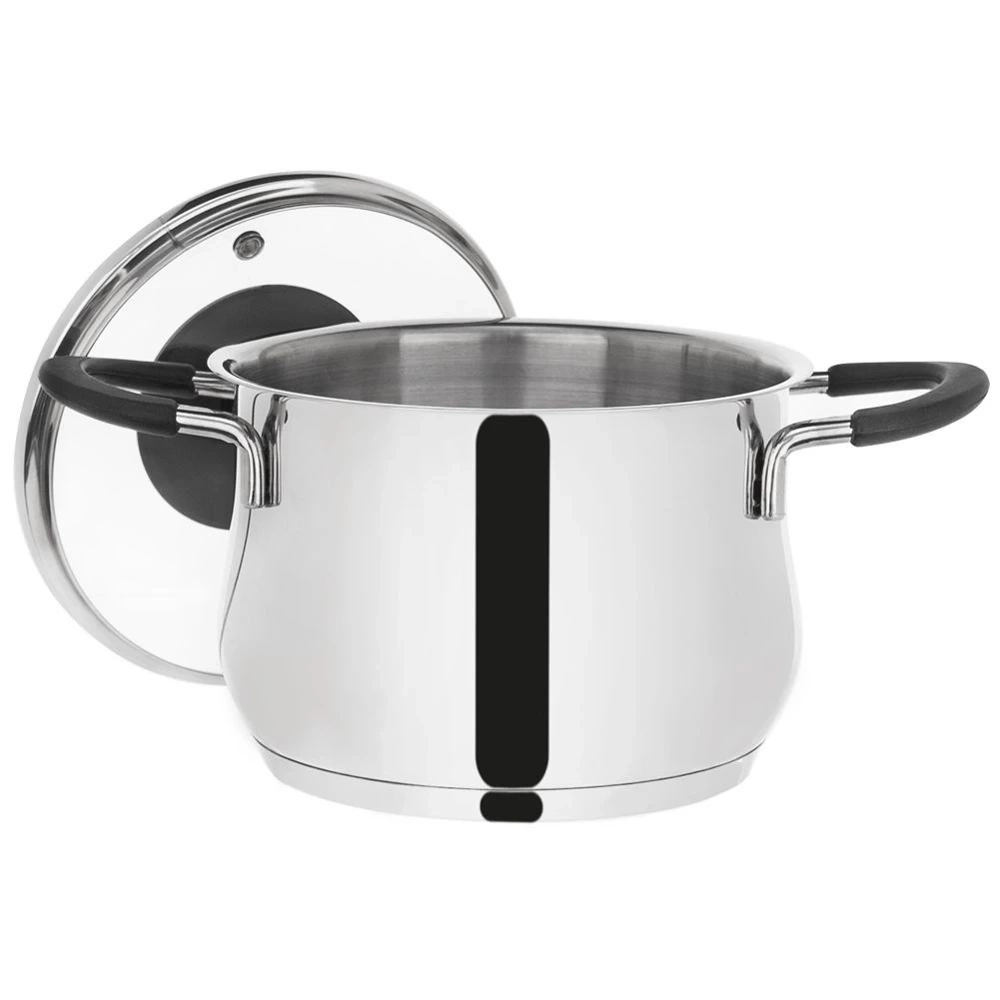 - NIEZAWODNY - Garnek premium z serii DALIE o średnicy 16 cm i pojemności 2,4 litra z pokrywką. Garnek wykonany z najwyższej jakości stali nierdzewnej 304 - 18/10. Jego zewnętrzna strona została polerowana na wysoki połysk, natomiast wewnętrzna jest matowa. Uchwyty garnka pokryte są czarnym silikonem, który nie nagrzewa się podczas gotowania. Wyposażony w pokrywkę wykonaną ze szkła i stali nierdzewnej. Wymiary zewnętrzne garnka: 27 x 16 x 12 cm, wysokość z pokrywką wynosi 17,5 cm.