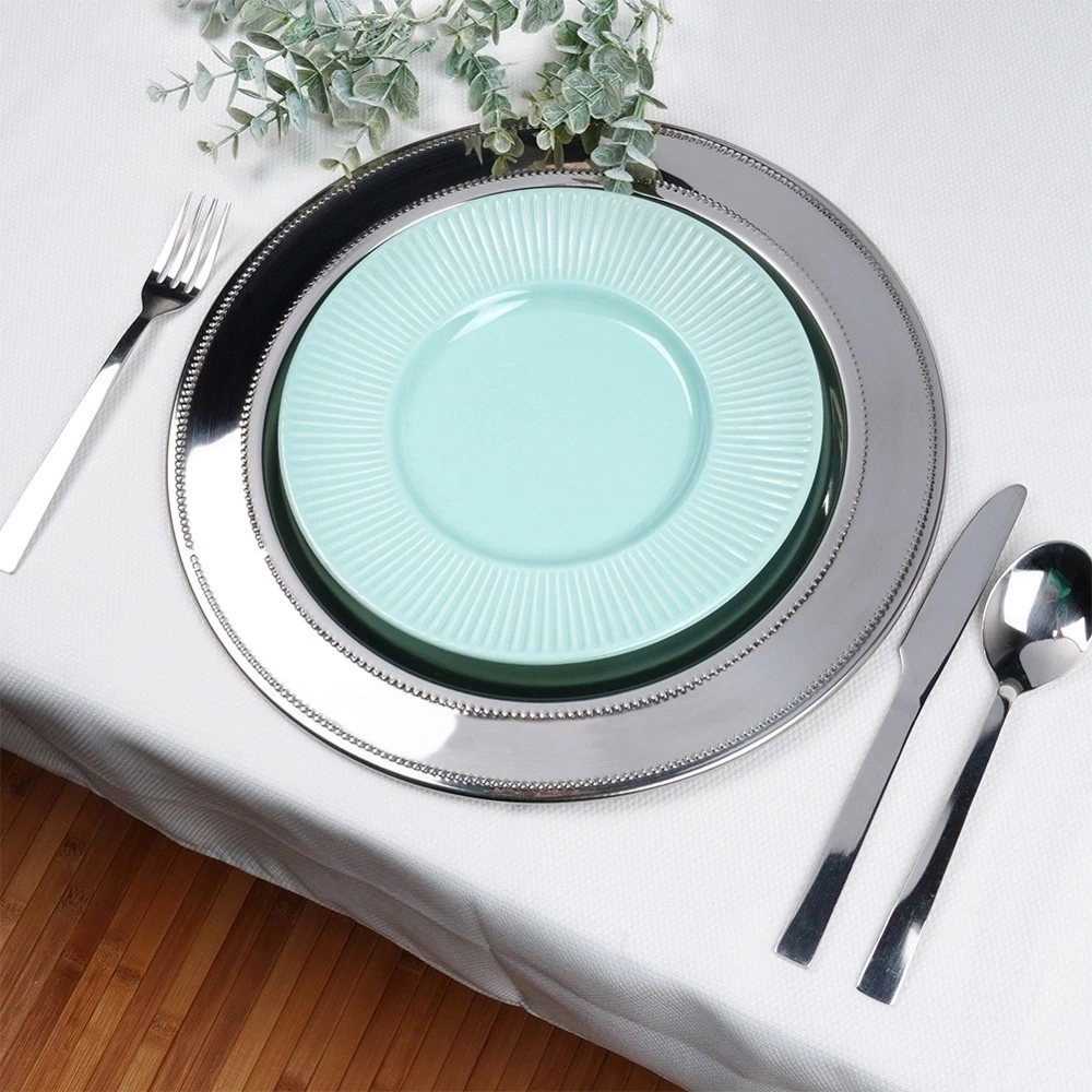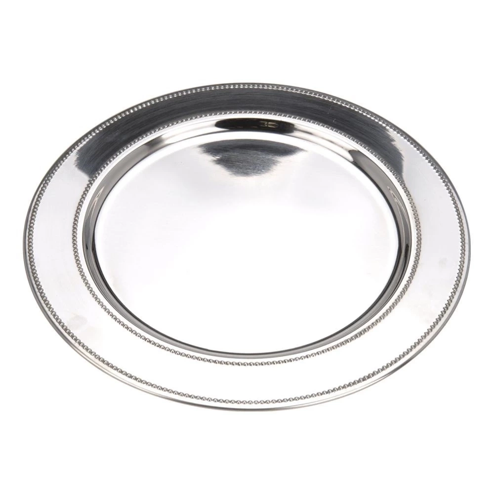 - Dekoracyjna podkładka pod talerze o średnicy 33 cm. Wykonana ze stali nierdzewnej w srebrnym kolorze. Sprawdzi się także do serwowania przekąsek i kanapek.