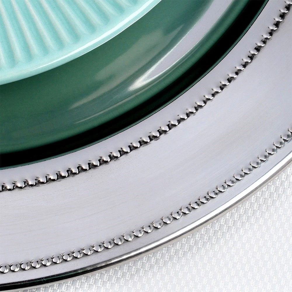 Stalowy podtalerz z szerokim, ozdobnym rantem. Podkładka wykonana jest z wytrzymałych materiałów, prezentuje się bardzo efektownie. Stanowi piękną ozdobę zastawy stołowej podczas rodzinnych obiadów. Z jej pomocą uzyskamy oryginalne nakrycie stołu. Sprawdzi się jako taca do serwowania kanapek, przekąsek, przystawek, ciasteczek itd. Idealna także jako elegancka podstawka pod butelkę szampana i kieliszki. Dodatkowo, może służyć jako podstawa pod elementy dekoracyjne np. kompozycje świec. Oryginalny produkt holenderskiej marki Home Styling Collection. Wyprodukowano zgodnie z europejskimi standardami.
