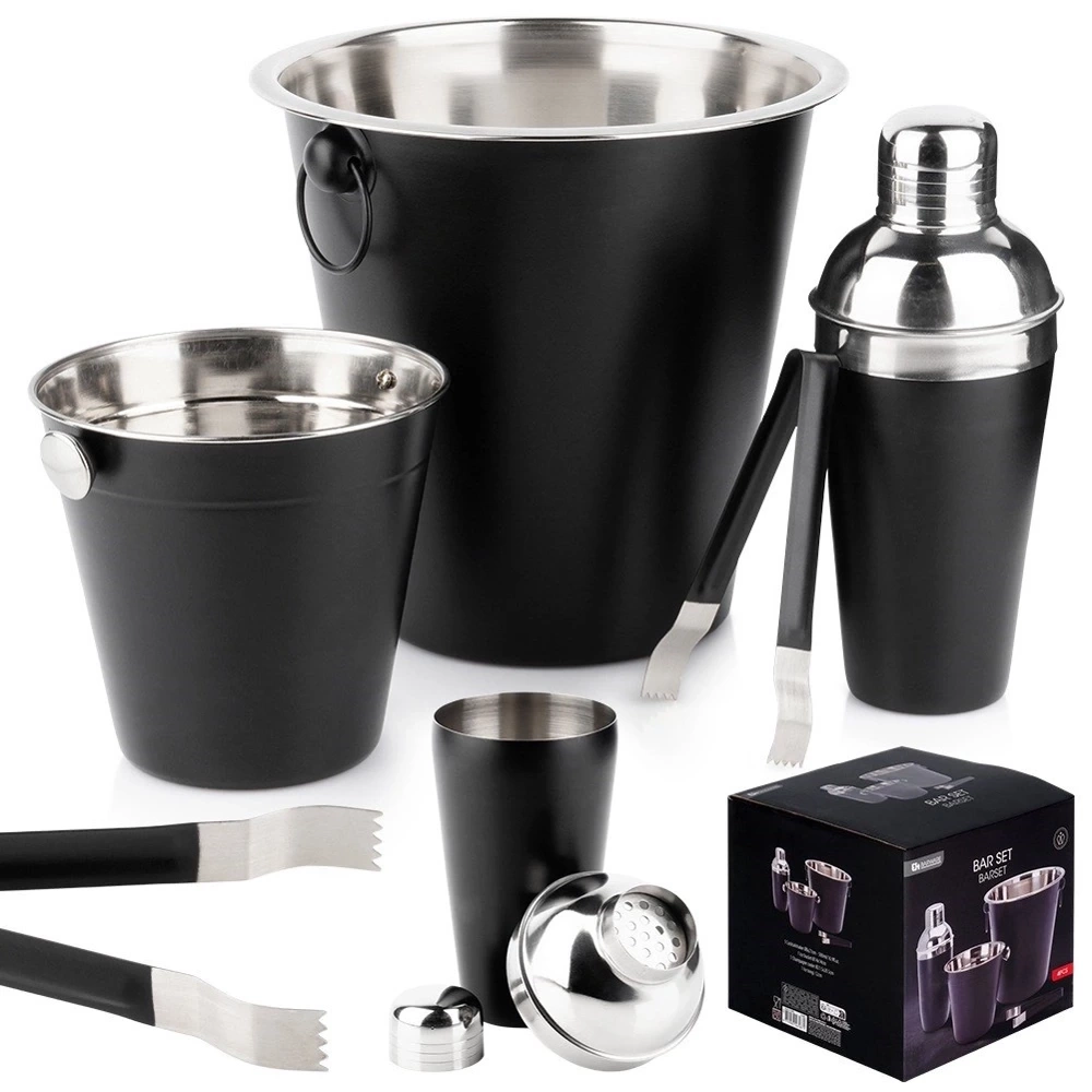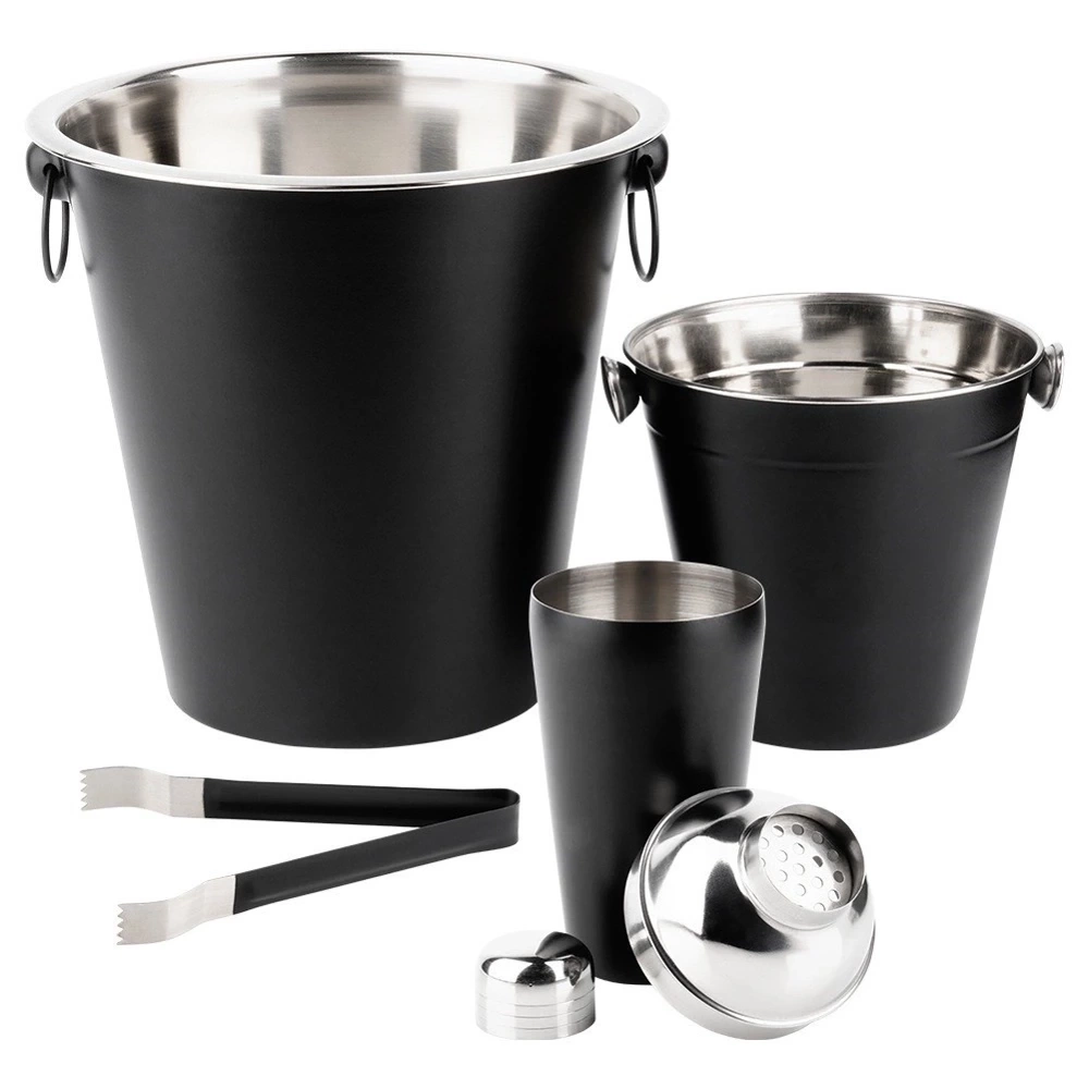 - PRZYDATNY - Zestaw barmański składający się z 4-elementów. Idealny do przygotowania koktajli i drinków, a także serwowania alkoholi. W zestawie: wiaderko małe na lód, wiaderko duże na butelkę, shaker oraz szczypce do lodu.