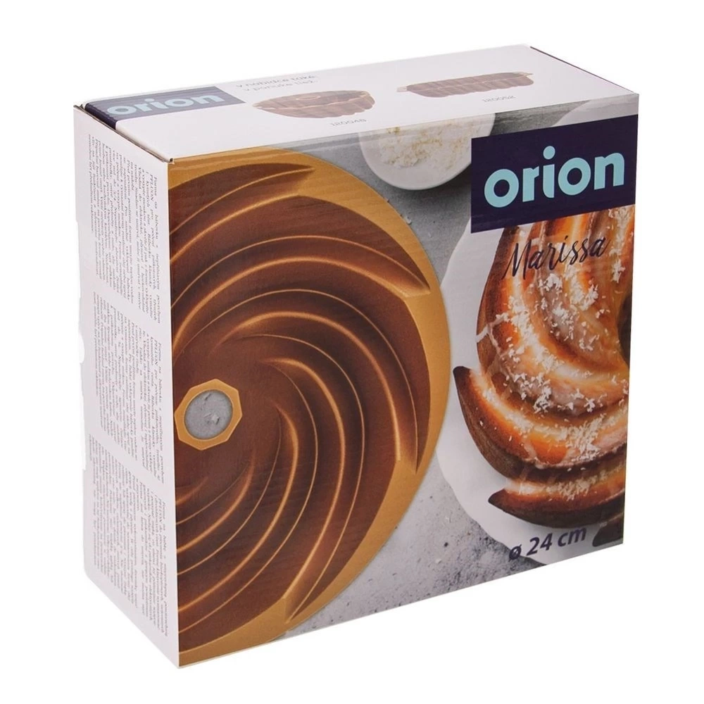Forma do babki z kominem o średnicy 24 cm. Świetnie sprawdzi się do przygotowania babki z pięknym orientalnym stylu. Forma malowana jest natryskowo w kolorze miedzi. Posiada wyjątkowy wzór, dzięki czemu upieczone potrawy będą niezwykle efektownie się prezentować. W celu odpowiedniej pielęgnacji, nie zaleca się mycia w zmywarce do naczyń. Forma zapakowana jest w kartonowe pudełko, stanowi wyjątkowy prezent dla miłośników przygotowywania wypieków. Oryginalny produkt czeskiej marki Orion. Wyprodukowano zgodnie z europejskimi standardami.