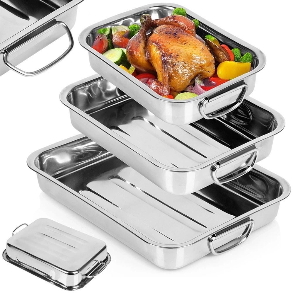 - STALOWE - Zestaw trzech stalowych blach do pieczenia o uniwersalnym zastosowaniu. Blachy posiadają grube i solidne ścianki boczne naczynia a wykorzystana w nich stal nierdzewna, polerowana jest na wysoki połysk. W zestawie: mała brytfanna o wymiarach 27,5 x 20,5 x 5,5 cm, średnia brytfanna 32 x 24,5 x 5,5 cm, duża brytfanna 37 x 28 x 5,5 cm.