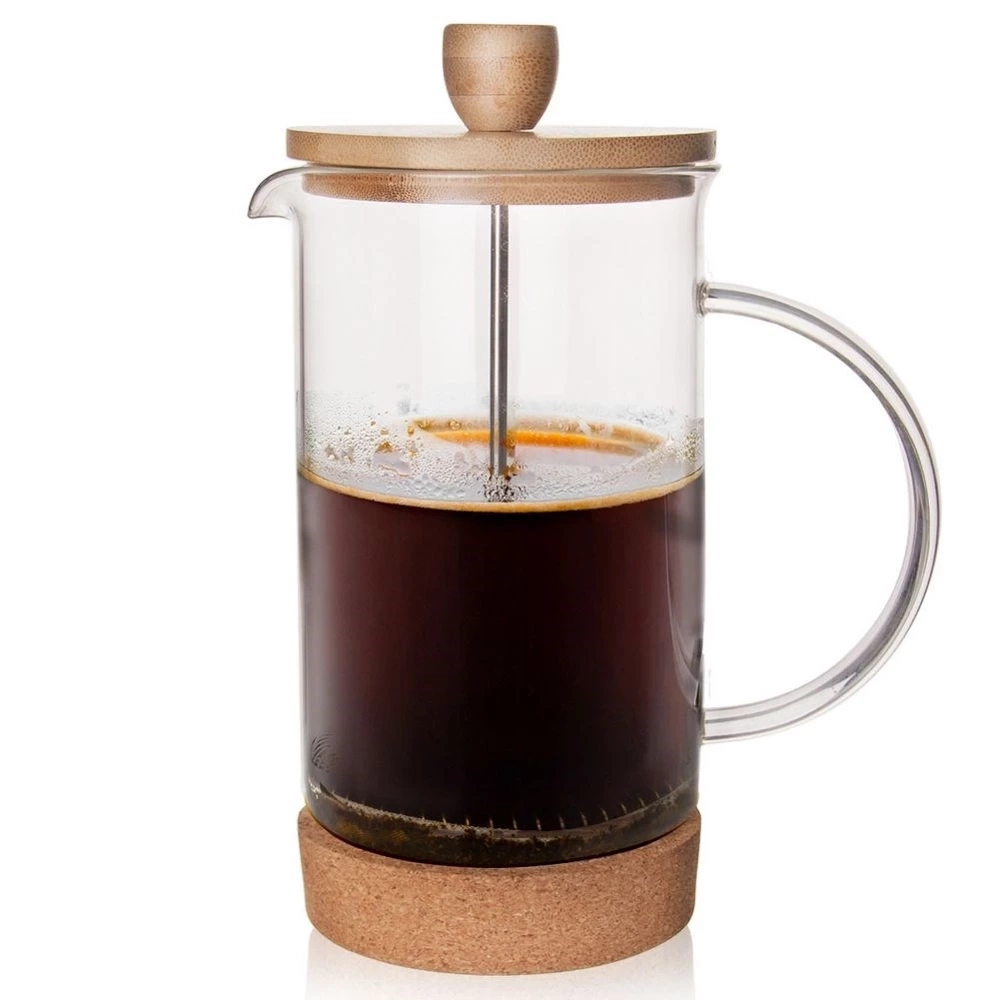 - WYTRZYMAŁY - Dzbanek i uchwyt wykonany z żaroodpornego, przezroczystego szkła borokrzemowego, a tłok oraz sitko wykonane z najwyższej jakości stali nierdzewnej. Dzbanek posiada pokrywkę wykonaną z drewna bambusowego oraz zdejmowaną podstawę z korka. Szkło jest odporne na temperatury do 180 °C.