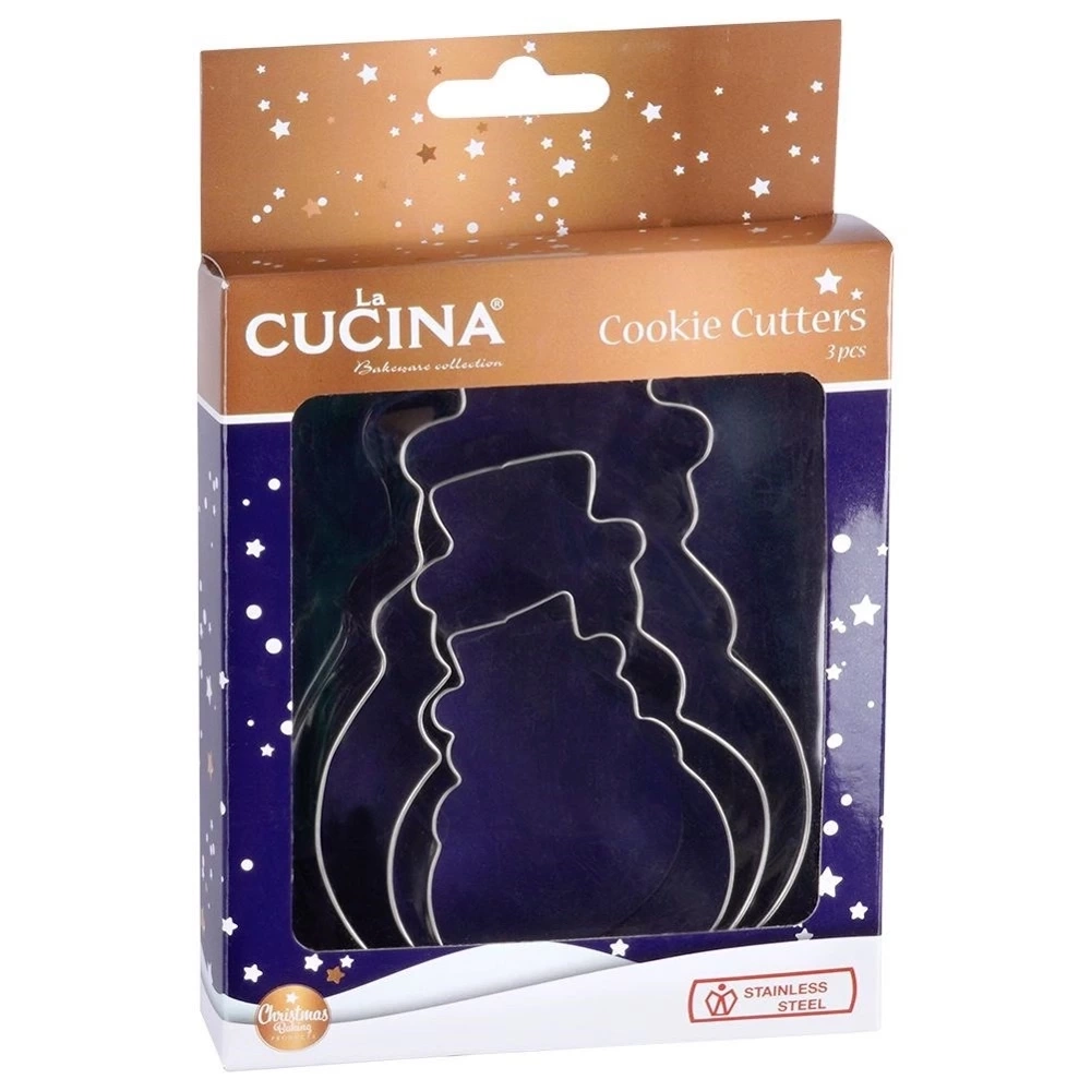 Komplet trzech wykrawaczy cukierniczych pozwoli stworzyć pierniczki oraz ciasteczka w kształcie bałwanka. Świetnie sprawdzą się w okresie świątecznym. Niezastąpione w kuchni, przydatne dla miłośników pieczenia. Dzięki nim przygotujesz ciastka o wyjątkowym wzorze. Wykrawacze pozwolą stworzyć również mini kanapki w oryginalnym kształcie lub ozdoby z masy cukrowej. Foremki są wygodne w przechowywaniu, gdyż wchodzą jedna w drugą, co sprawia, że zajmują mało miejsca w szafce. Oryginalny produkt holenderskiej marki La Cucina. Wyprodukowano zgodnie z europejskimi standardami.