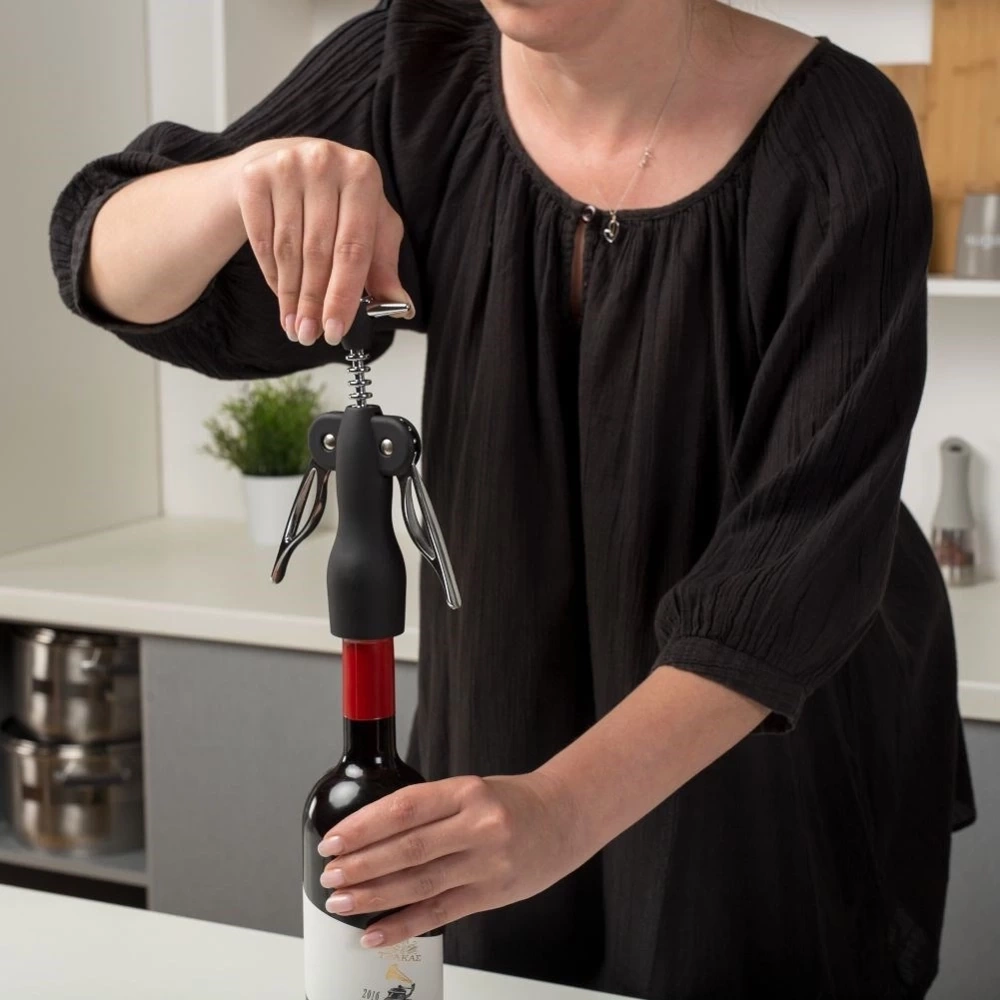 - Korkociąg pomoże w otwarciu butelki z ulubionym winem. Wykonany ze stali nierdzewnej i tworzywa w matowym, czarnym kolorze. Doskonale nadaje się na prezent.