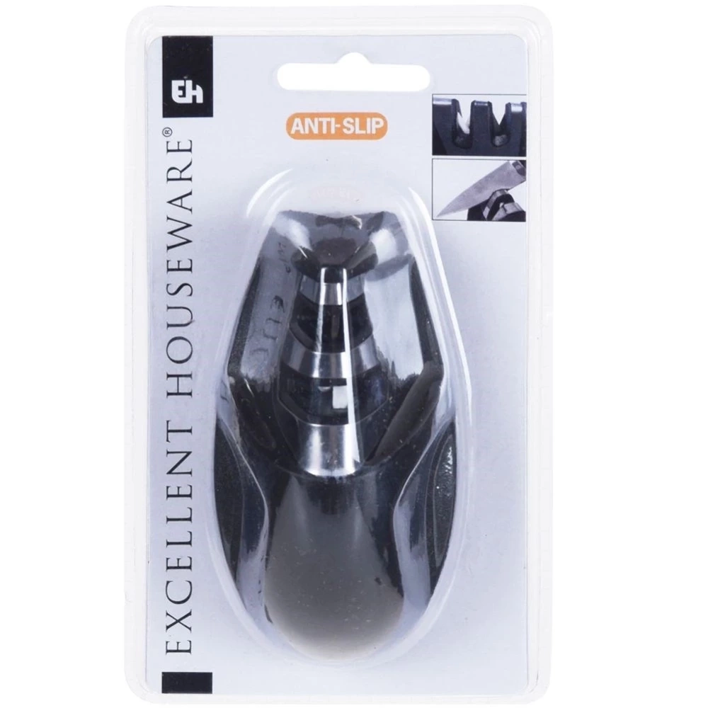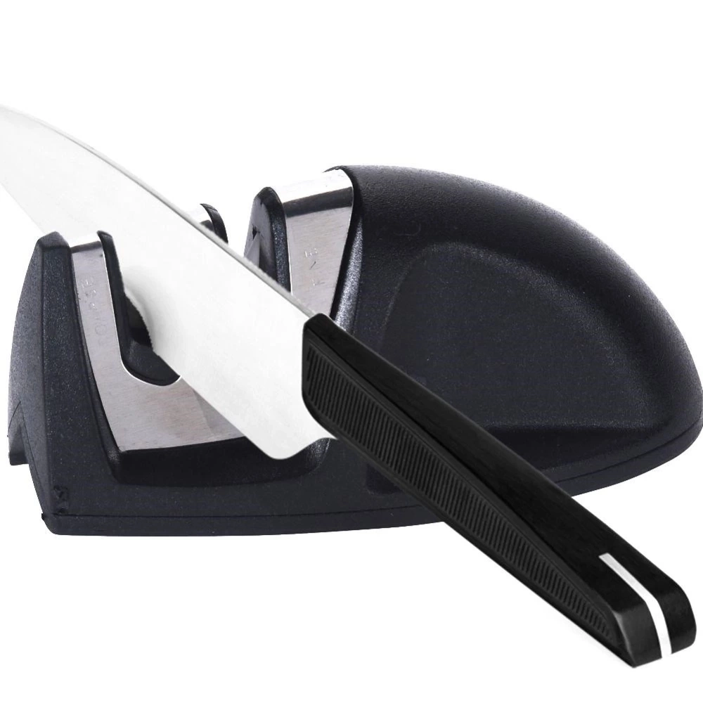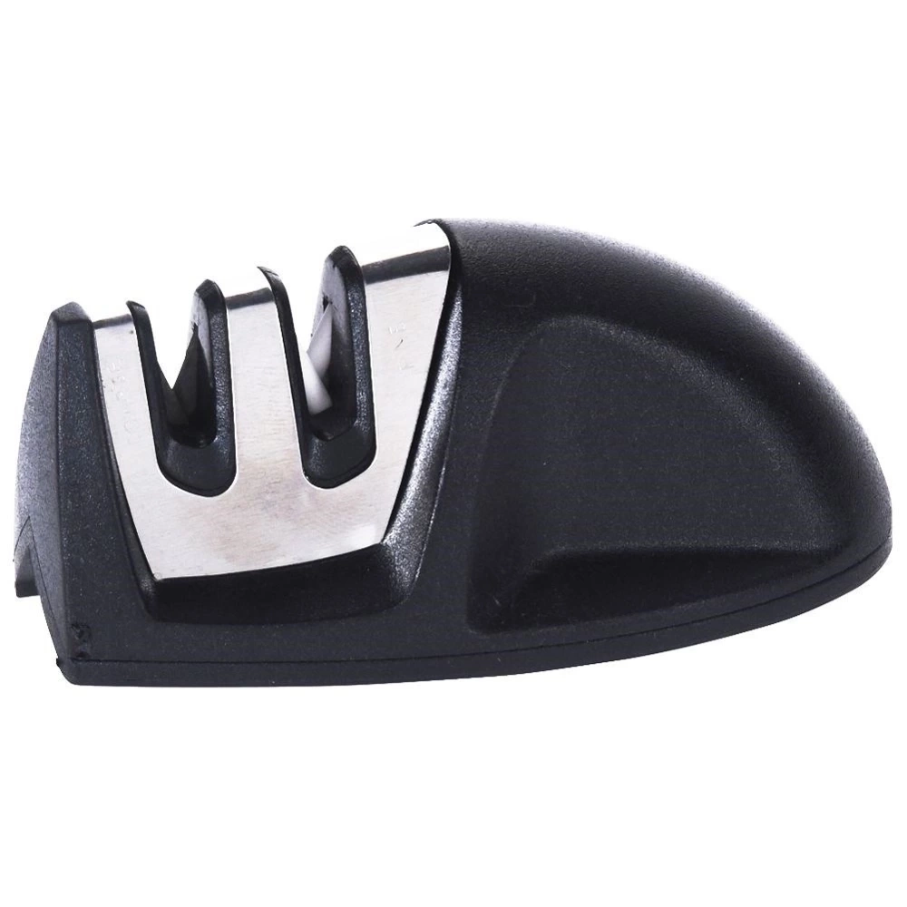 - PRAKTYCZNA - Ostrzałka posiada dwie głowice: węglową do ostrzenia oraz ceramiczną do polerowania. Nadaje się do prostych noży kuchennych, np. szefa kuchni.