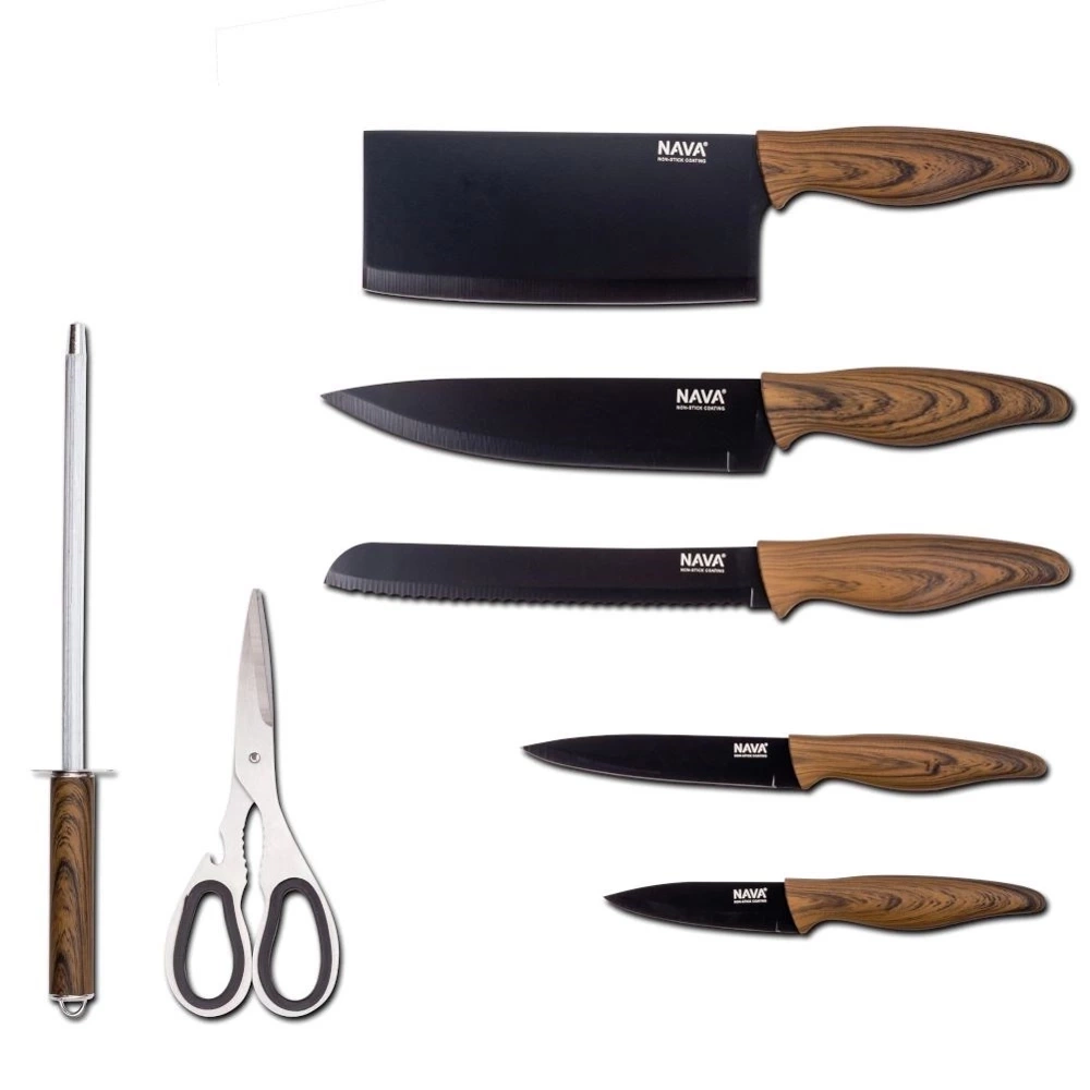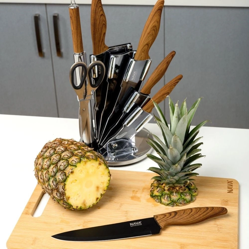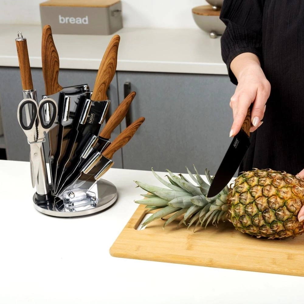 Komplet noży w stojaku składający się z 8 elementów. W zestawie: nóż szefa kuchni (długość całkowita 32 cm, długość ostrza 19,5 cm, szerokość ostrza 4 cm), nóż uniwersalny (długość całkowita 22,5 cm, długość ostrza 12,5 cm, szerokość ostrza 2 cm), nóż do obierania (długość całkowita 19 cm, długość ostrza 9 cm, szerokość ostrza 2 cm), nóż do chleba (długość całkowita 32 cm, długość ostrza 19,5 cm, szerokość ostrza 2,5 cm), tasak (długość całkowita 30 cm, długość ostrza 17 cm, szerokość ostrza 7 cm), nożyczki (długość 18 cm), ostrzałka (długość 29,5 cm), stojak (średnica 17 cm). Solidnie wykonane z wytrzymałych materiałów. Noże będą przydatne podczas różnych prac w kuchni, a stojak sprawdzi się do ich przechowywania. Noże nadają się do mycia w zmywarce do naczyń, zaleca się jednak mycie ręczne a następnie wytarcie do sucha noży po umyciu lub wyjęciu ze zmywarki. Ciekawy, a zarazem klasyczny wygląd sprawia, że zestaw wpasuje się do każdej kuchni. Oryginalny produkt greckiej marki NAVA. Wyprodukowano zgodnie z europejskimi standardami.