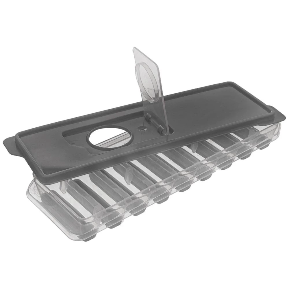 - Forma na dziewięć podłużnych kostek lodu, z wygodną pokrywką i otworem na wlewanie wody. Łatwe wyciąganie gwarantuje silikonowe dno.