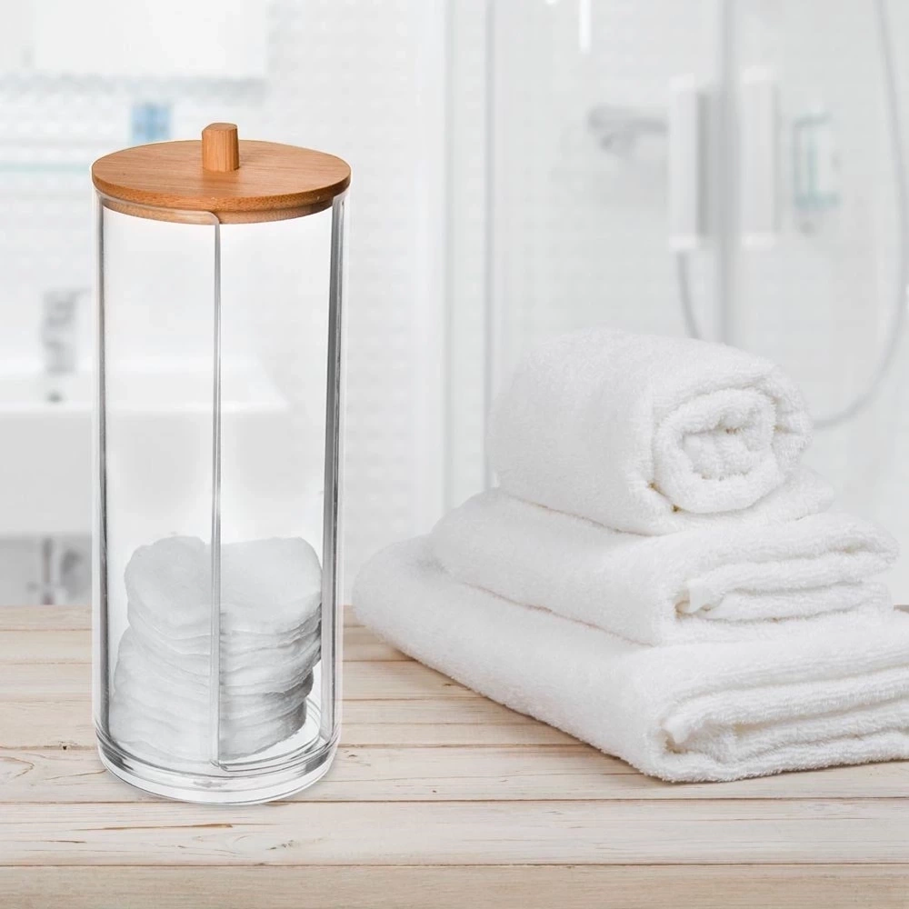- Praktyczny pojemnik na płatki kosmetyczne. Posiada pokrywkę wykonaną z drewna bambusowego. Ma wyjątkowo atrakcyjny wygląd w porównaniu do opakowań jednorazowych.