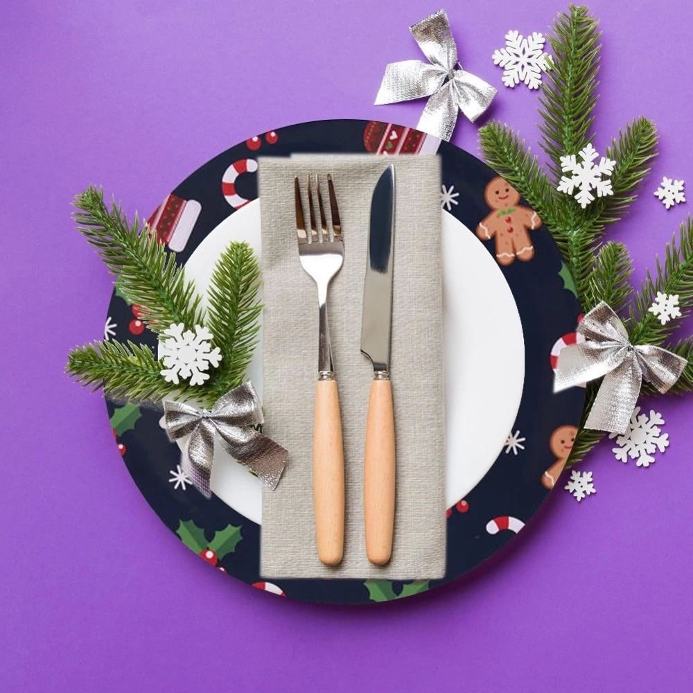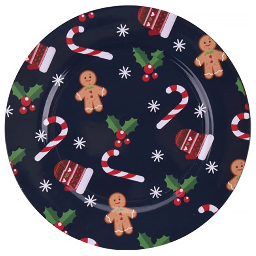 - Dekoracyjna podkładka pod talerze o średnicy 33 cm. Wykonana z wysokiej jakości tworzywa z motywem świątecznych ludzików z piernika, jemioły i lizaków.