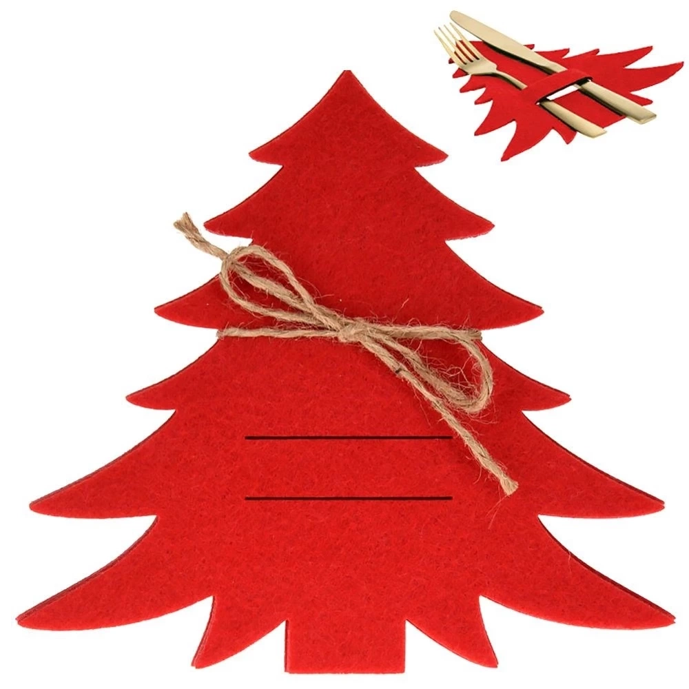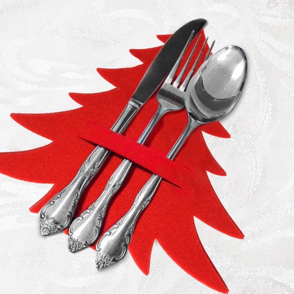- Świąteczne etui na sztućce wykonane z filcu w kolorze czerwonym. W zestawie znajdują się 4 sztuki etui w kształcie choinki. Oryginalna dekoracja w okresie świątecznym.
