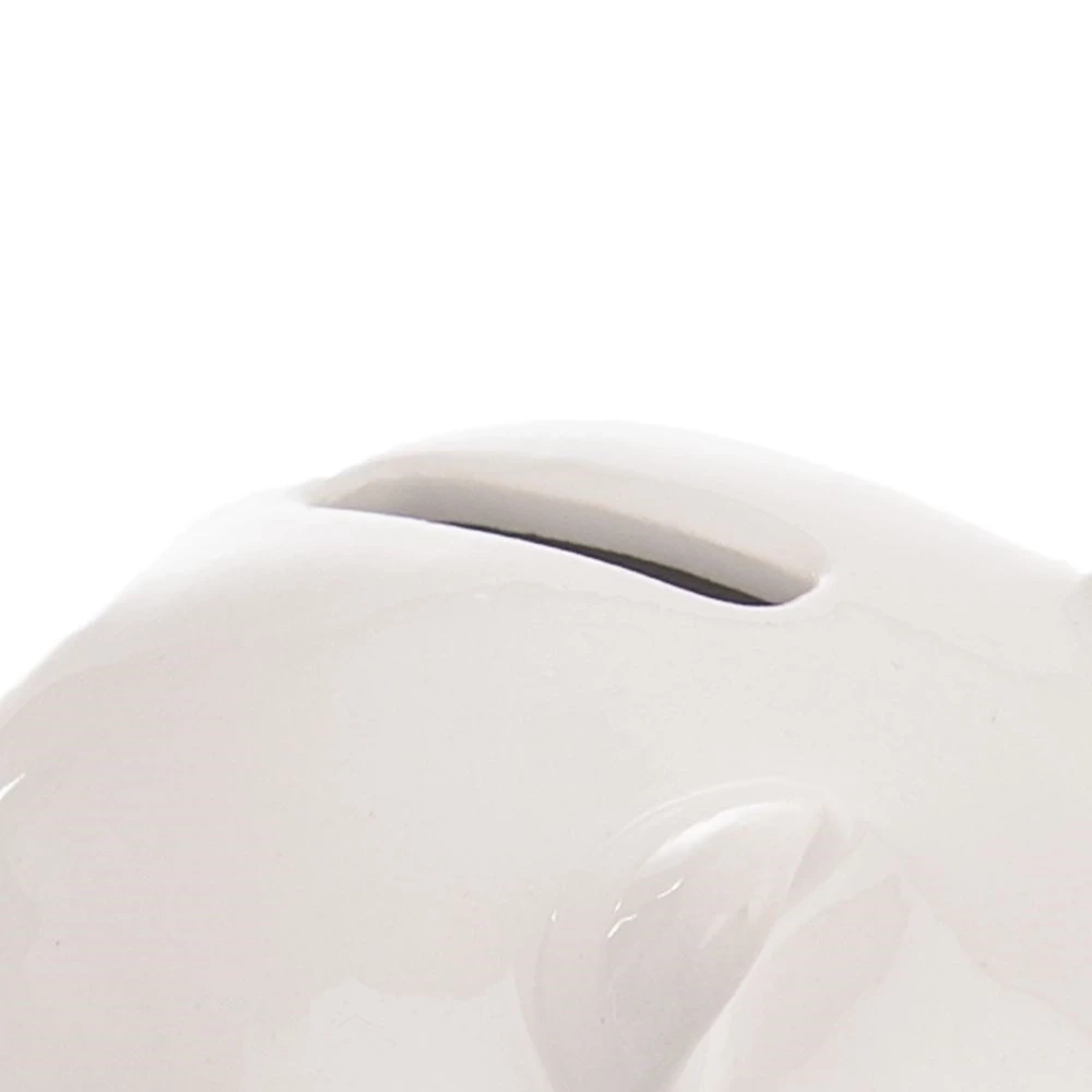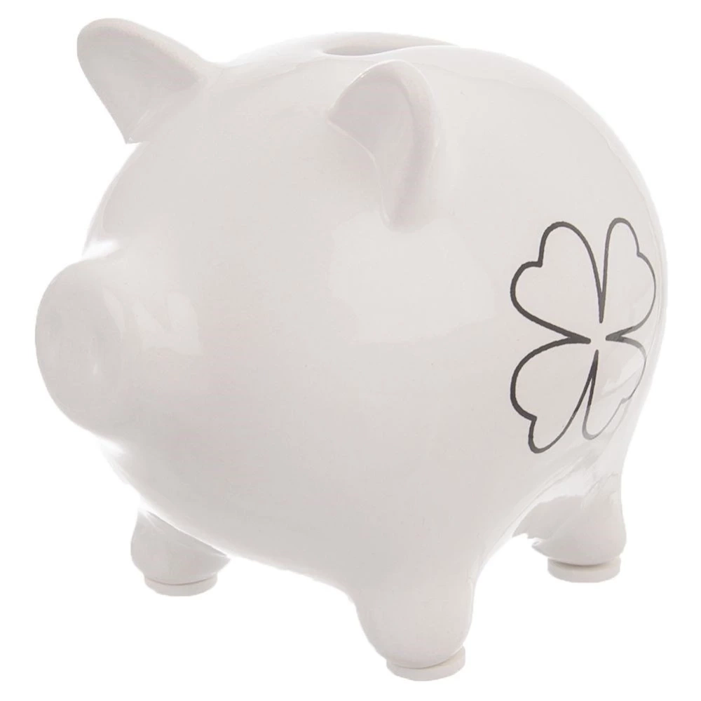 - Świnka skarbonka wykonana z ceramiki w kolorze białym z motywem koniczynki. Pomoże w zbieraniu oszczędności. Nie posiada otworu do wyjmowania pieniędzy.