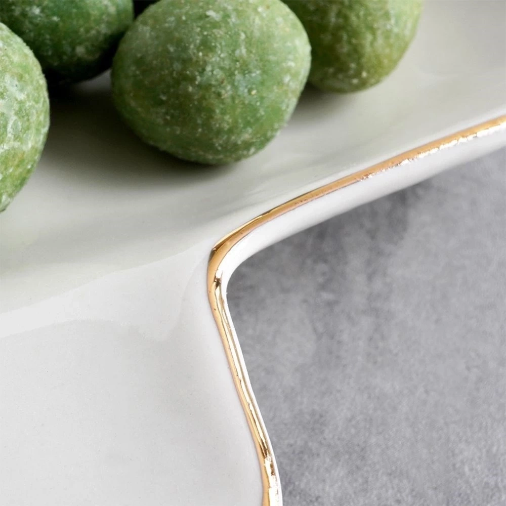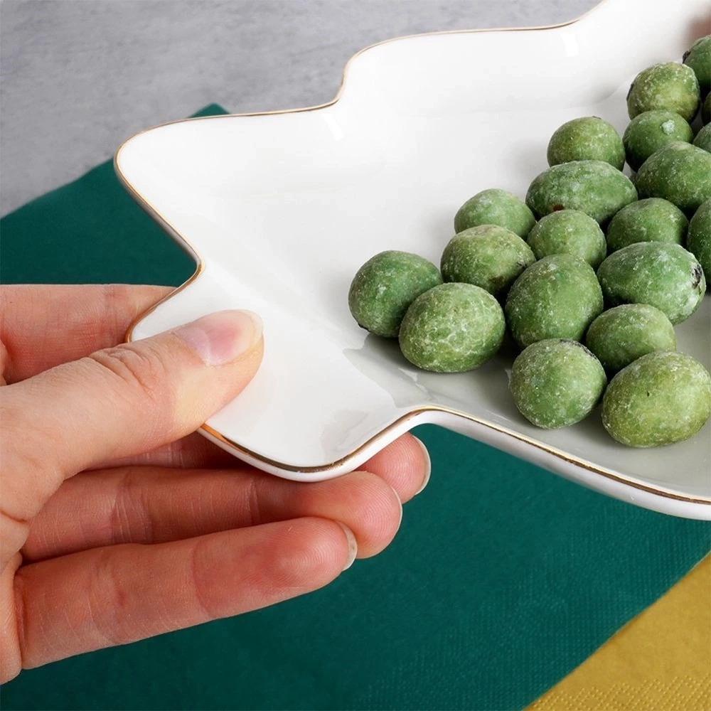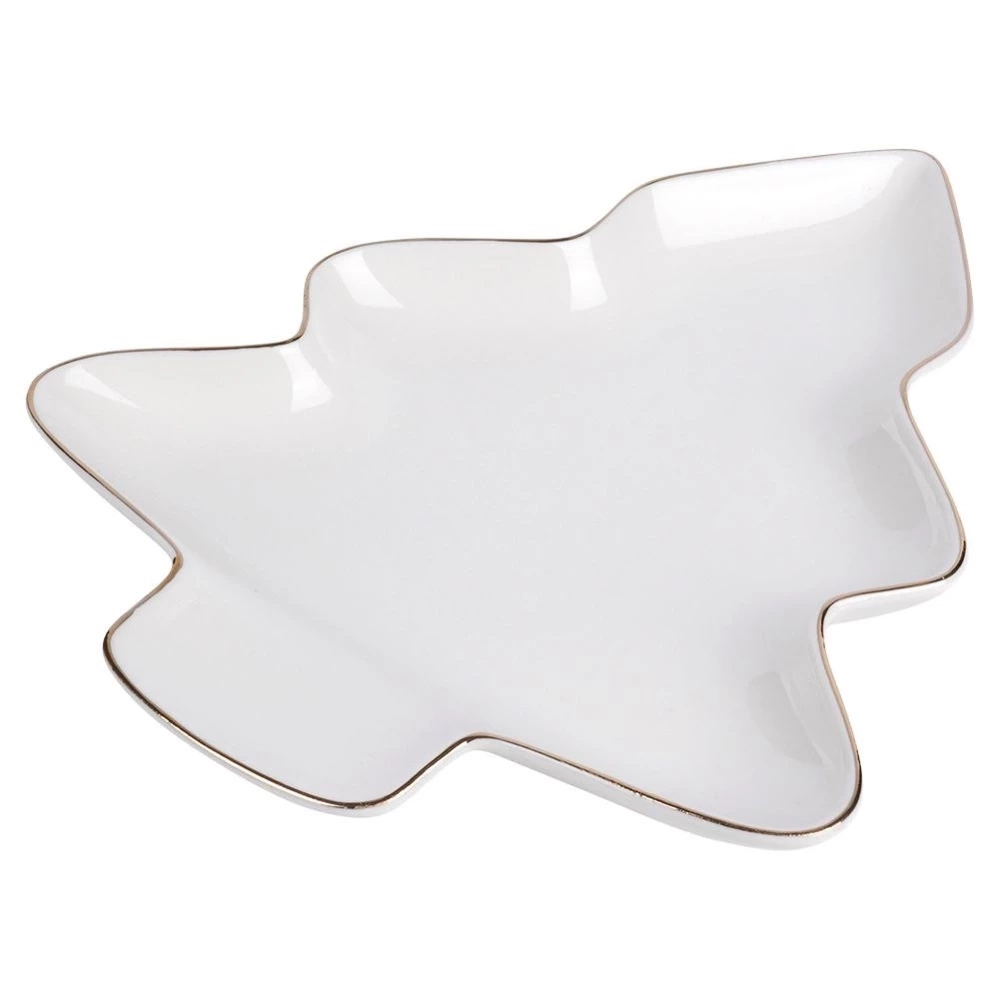 - Porcelanowy talerz w kształcie choinki z pięknymi złotymi zdobieniami. Idealny na czas Świąt Bożego Narodzenia. Świetnie sprawdzi się na przekąski lub desery.