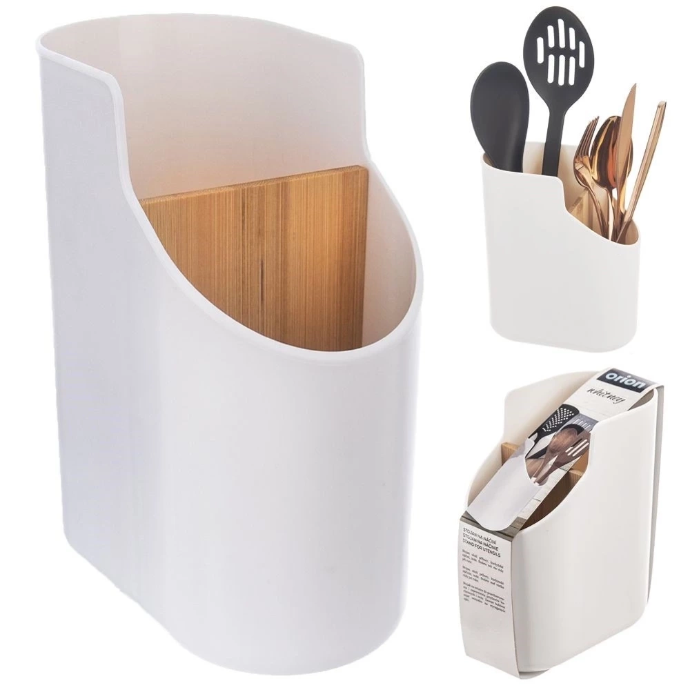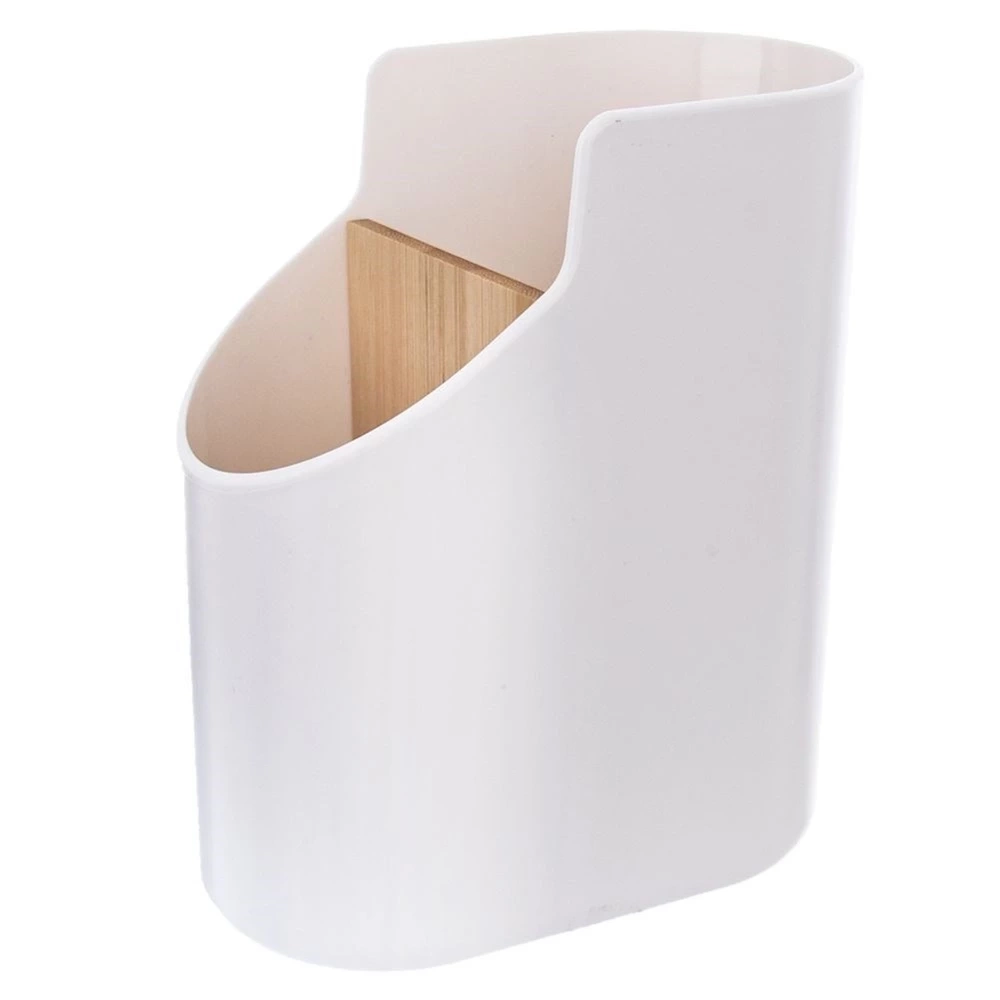 - WYTRZYMAŁY - Pojemnik na sztućce i przybory kuchenne. Wykonany z wysokiej jakości tworzywa w kolorze białym a przegródka z drewna bambusowego. Ociekacz ma wymiary 17,5 x 14,5 x 8,5 cm.