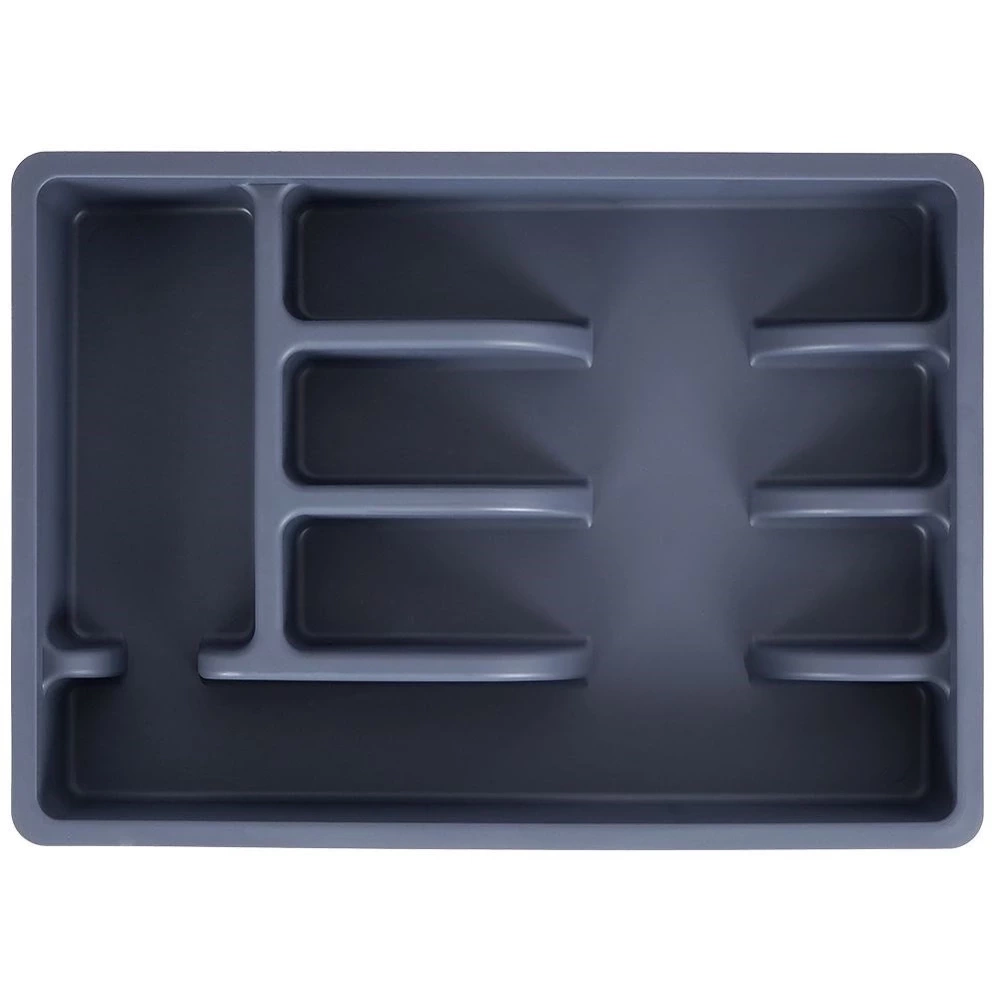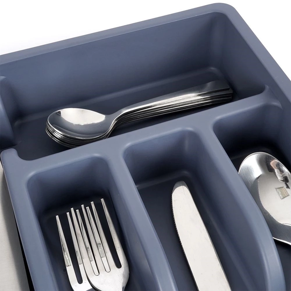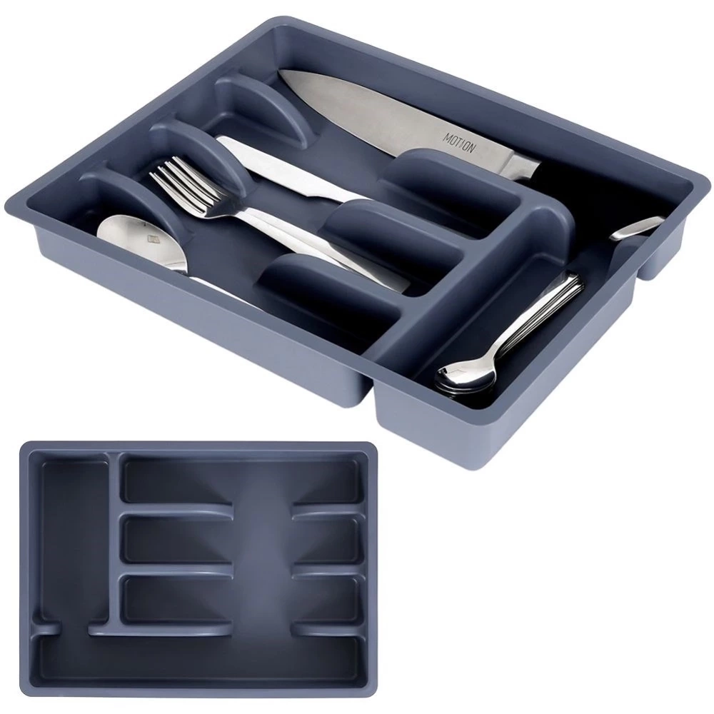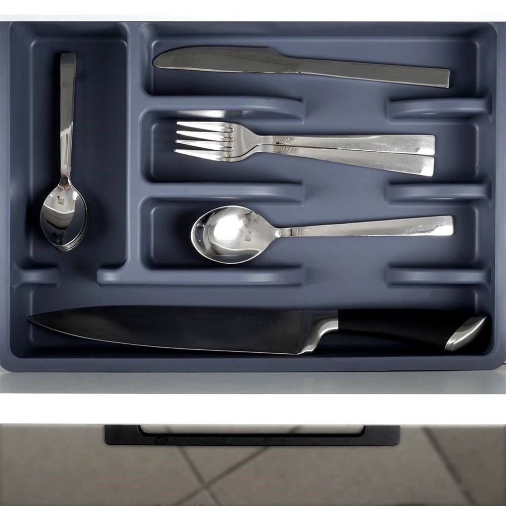- Organizer na sztućce do szuflady. Wykonany z wysokiej jakości tworzywa w grafitowym kolorze. Łącznie posiada 5 przegródek na sztućce, łyżeczki oraz przybory kuchenne.