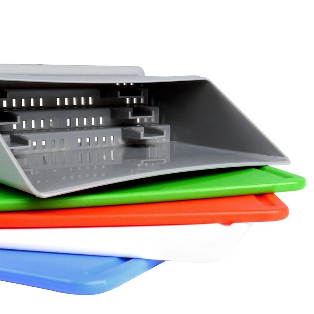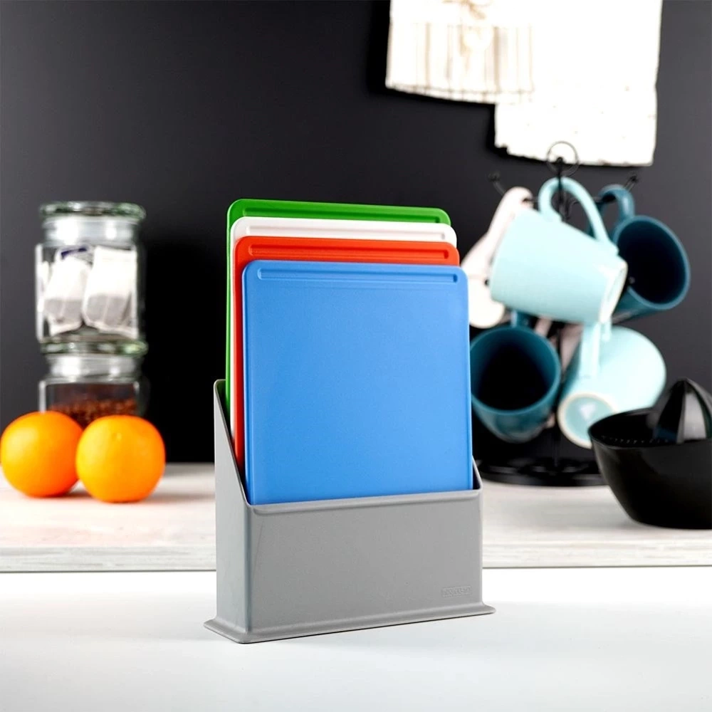 Komplet 4 desek do krojenia wykonanych z wysokiej jakości tworzywa w 4 różnych kolorach. Każdy z kolorów odpowiada za przeznaczenie deski, dzięki czemu w łatwy sposób odróżnimy deski wraz z ich przeznaczeniem. Deski umieszczone są w wygodnym i stabilnym stojaku w srebrnym kolorze. Deski są też świetnym pomysłem na prezent. Wyprodukowano zgodnie z europejskimi standardami.